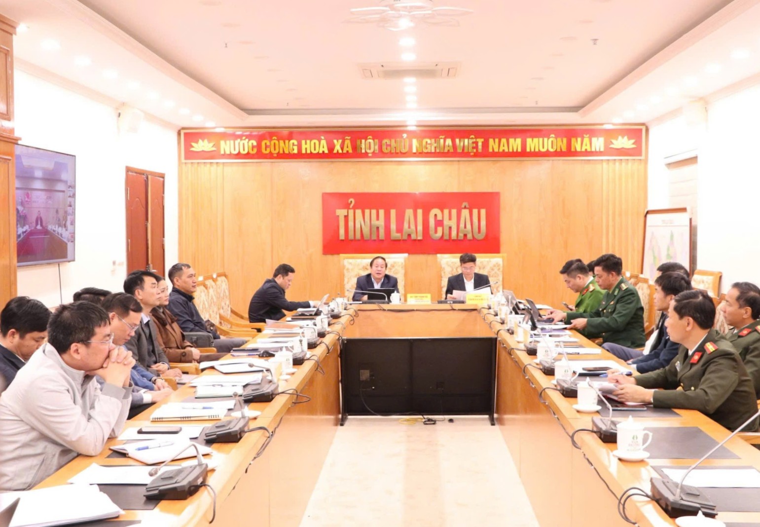 Dự Hội nghị tại điểm cầu tỉnh Lai Châu có đồng chí Tống Thanh Hải - Phó Chủ tịch Thường trực UBND tỉnh; đại diện lãnh đạo các sở, ban, ngành có liên quan; đại diện các nhà thầu thi công các công trình trường phổ thông nội trú liên cấp tiểu học và trung học cơ sở tại các xã biên giới…