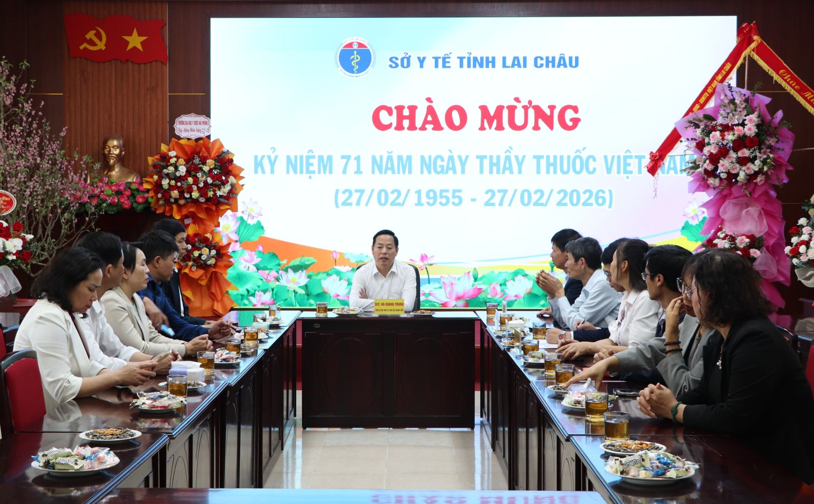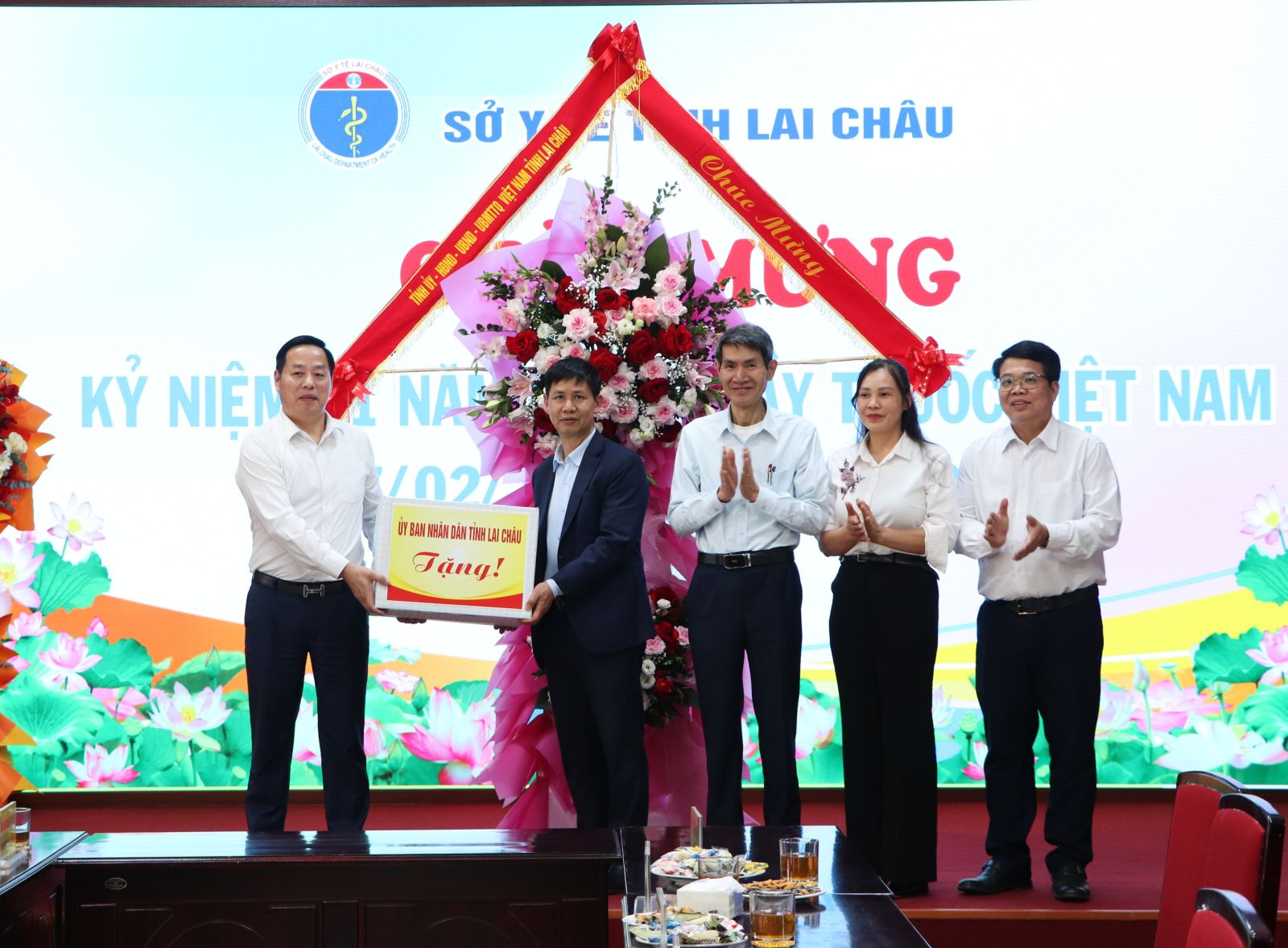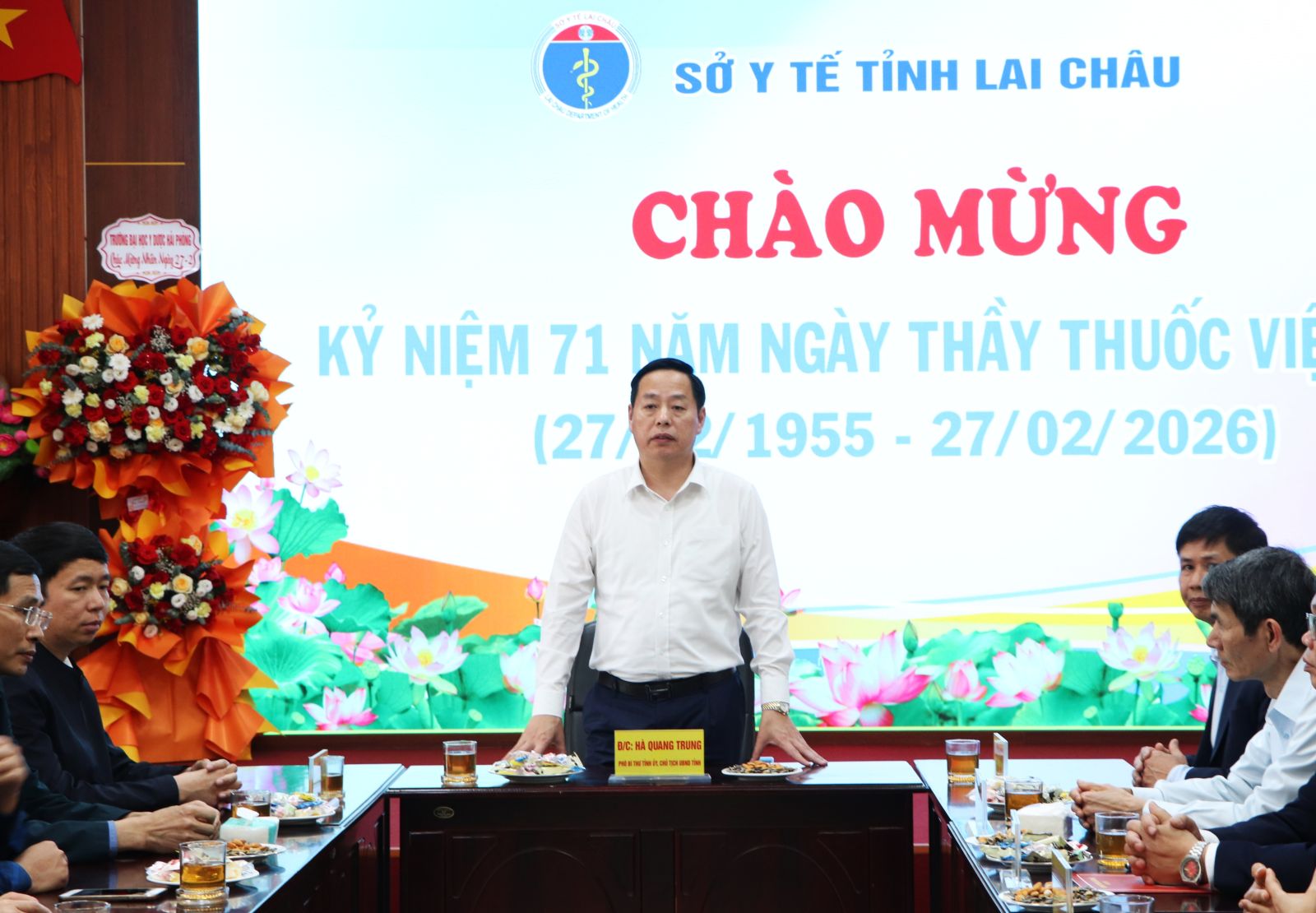 Tặng hoa, gửi lời chúc mừng tốt đẹp và lời cảm ơn đến đội ngũ cán bộ toàn ngành Y tế của tỉnh đã luôn tận tụy, hết lòng vì sức khỏe của Nhân dân, đồng chí Hà Quang Trung - Phó Bí thư Tỉnh ủy, Chủ tịch UBND tỉnh đánh giá cao những nỗ lực của ngành Y tế trong công tác khám chữa bệnh, chăm sóc sức khỏe Nhân dân. Đồng chí khẳng định, trong kết quả chung của tỉnh nhiệm kỳ qua và năm 2025 có sự đóng góp rất tích cực của đội ngũ cán bộ, y, bác sĩ ngành Y tế Lai Châu. Đồng chí Chủ tịch UBND tỉnh mong muốn toàn ngành Y tế tiếp tục phát huy truyền thống, thực hiện tốt nhiệm vụ, đáp ứng sự phát triển nhanh, bền vững của tỉnh.