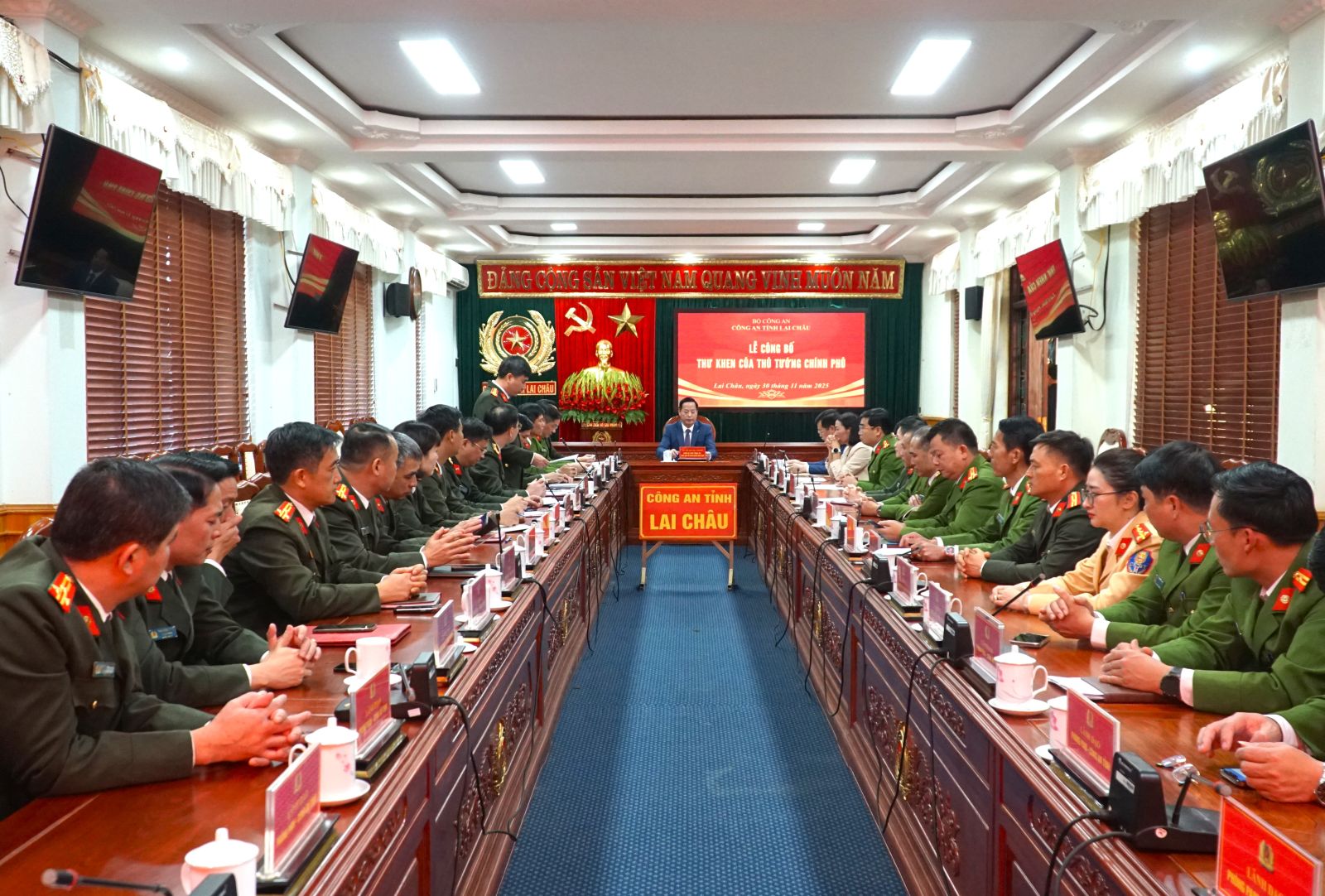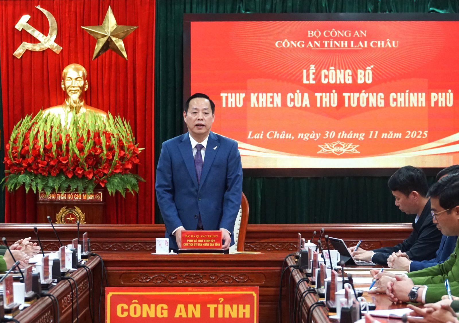 Trao thư khen của Thủ tướng Chính phủ và chúc mừng thành tích xuất sắc của lực lượng Công an tỉnh, đồng chí Hà Quang Trung - Phó Bí thư Tỉnh ủy, Chủ tịch UBND tỉnh đã gửi lời chúc mừng của đồng chí Bí thư Tỉnh ủy, đồng thời biểu dương, chúc mừng chiến công của lực lượng Công an Lai Châu. Đồng chí khẳng định, Thư khen của Thủ tướng Chính phủ là phần thưởng cao quý, là sự ghi nhận đầy trân trọng đối với trí tuệ, bản lĩnh và tinh thần vì Nhân dân phục vụ của cán bộ, chiến sĩ Công an tỉnh, cũng là niềm tự hào chung của Đảng bộ, chính quyền và Nhân dân các dân tộc tỉnh Lai Châu.