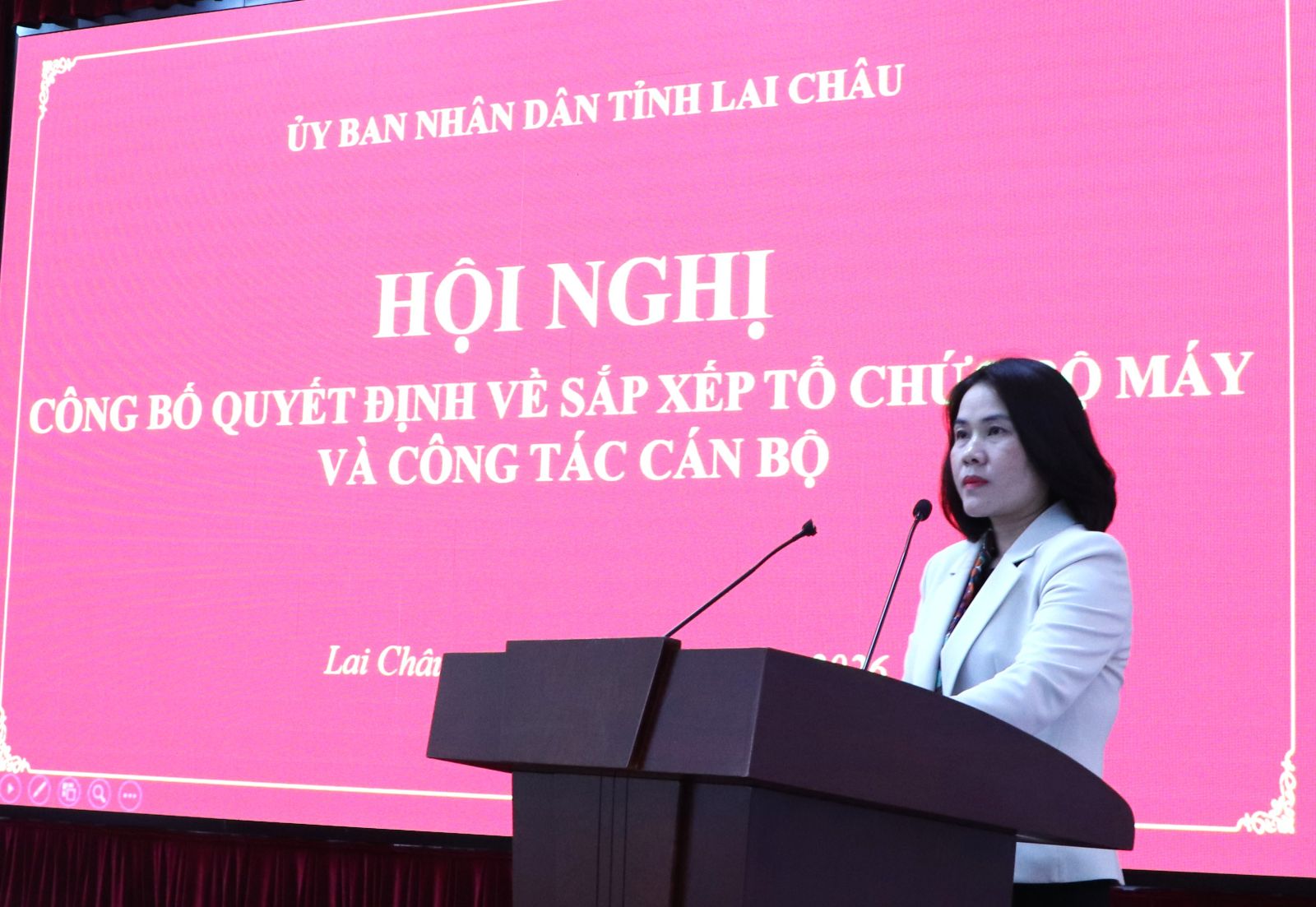 Tại Hội nghị, đồng chí Đào Thị Lan Anh - Giám đốc Sở Nội vụ đã công bố Quyết định Số 79/QĐ-UBND ngày 13/1/2026 của UBND tỉnh về việc sáp nhập Ban Quản lý dự án đầu tư xây dựng các công trình Dân dụng và Công nghiệp và Ban Quản lý dự án đầu tư xây dựng các công trình giao thông để thành lập Ban Quản lý dự án đầu tư xây dựng kể từ ngày 1/2/2026.