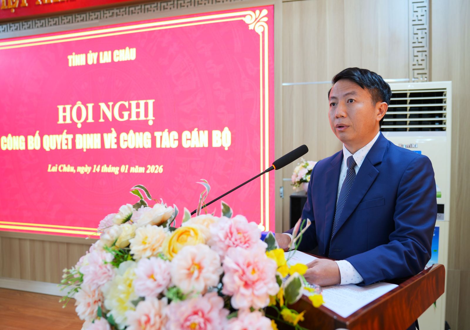 Theo đó, tại Hội nghị, đại diện lãnh đạo Ban Tổ chức Tỉnh ủy đã công bố các Quyết định điều động cán bộ. Tại Quyết định số 156-QĐ/TU, ngày 06/1/2026: Căn cứ quyết định số 6551/QĐ-ĐCT, ngày 26/12/2025 của Đoàn chủ tịch Trung ương Hội Liên hiệp Phụ nữ Việt Nam về công nhận Ban Chấp hành, Ban Thường vụ, Chủ tịch, Phó Chủ tịch Hội Liên hiệp Phụ nữ tỉnh Lai Châu khóa XIII, nhiệm kỳ 2025 - 2030; đồng chí Mùa Thị Lan, Phó Chủ tịch Hội Liên hiệp Phụ nữ tỉnh nhiệm kỳ 2025 - 2030 thôi giữ chức Phó Giám đốc Sở Tư pháp; điều động đến nhận nhiệm vụ tại cơ quan Ủy ban Mặt trận Tổ quốc tỉnh từ ngày 10/1/2026.