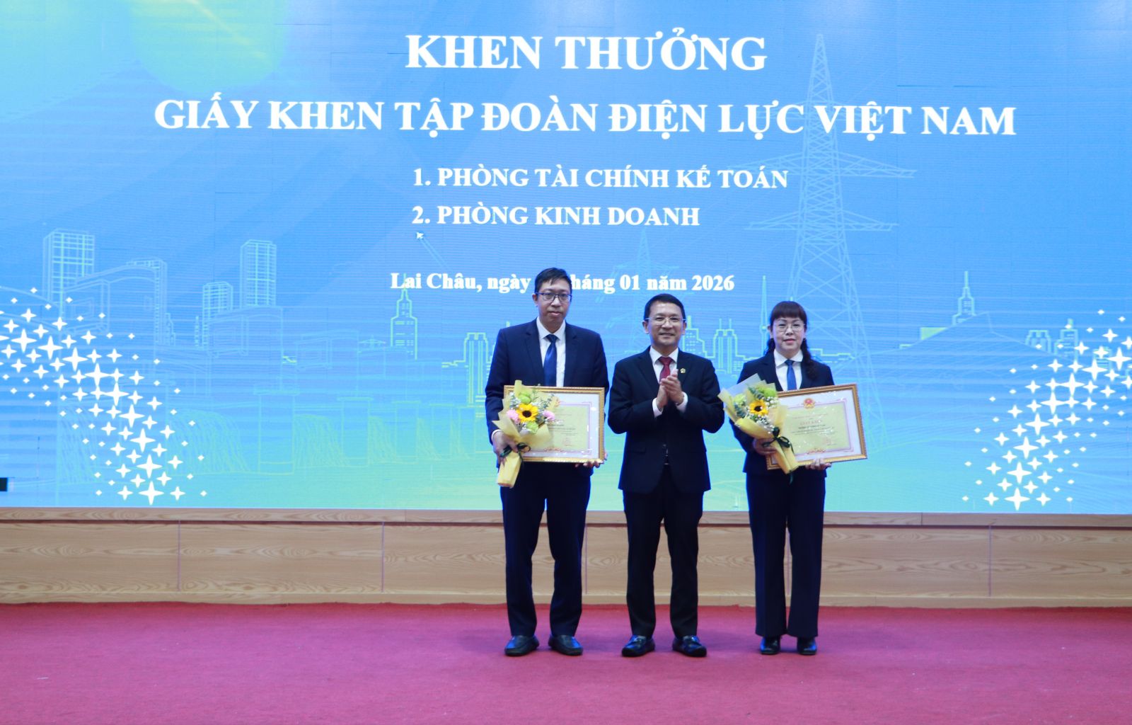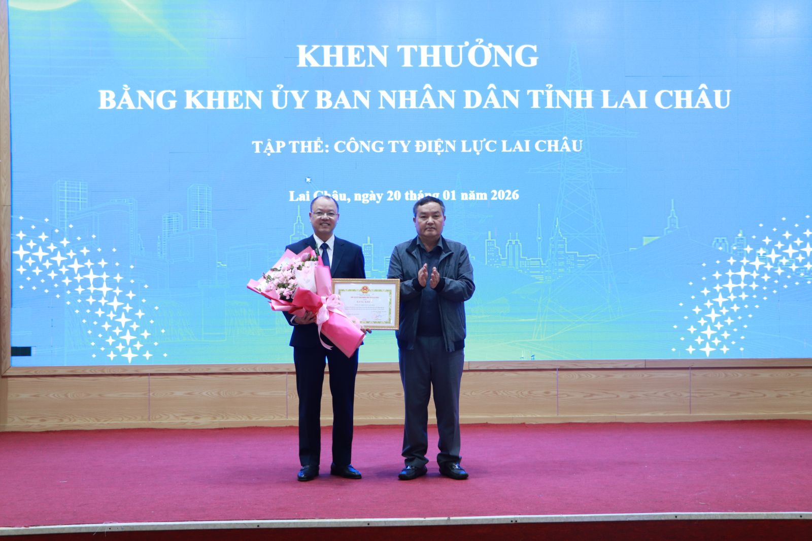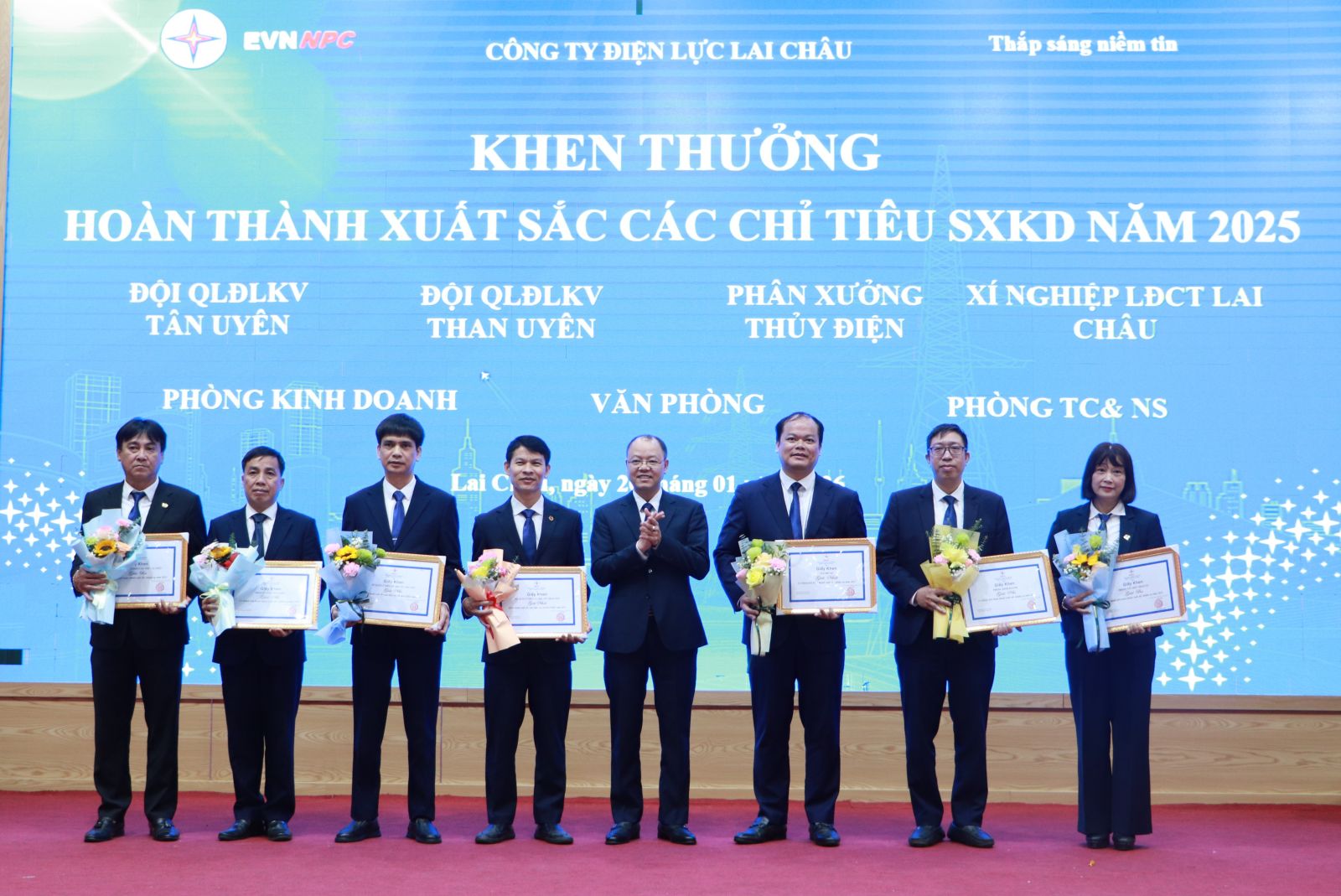 Nhân dịp này, Chủ tịch UBND tỉnh Lai Châu tặng Bằng khen cho tập thể Công ty Điện lực Lai Châu đã có thành tích xuất sắc trong phong trào thi đua chào mừng Đại hội Đảng các cấp, Đại hội thi đua yêu nước tỉnh Lai Châu giai đoạn 2025 - 2030. Tổng Công ty Điện lực miền Bắc tặng Giấy khen cho 3 sở, ngành của tỉnh Lai Châu đã hỗ trợ Tổng Công ty hoàn thành dự án đầu tư xây dựng các công trình điện. Tập đoàn Điện lực Việt Nam tặng Giấy khen cho 2 tập thể thuộc Công ty Điện lực Lai Châu hoàn thành tốt nhiệm vụ được giao năm 2025. Công ty Điện lực Lai Châu khen thưởng cho 7 đơn vị hoàn thành xuất sắc các chỉ tiêu sản xuất kinh doanh năm 2025…