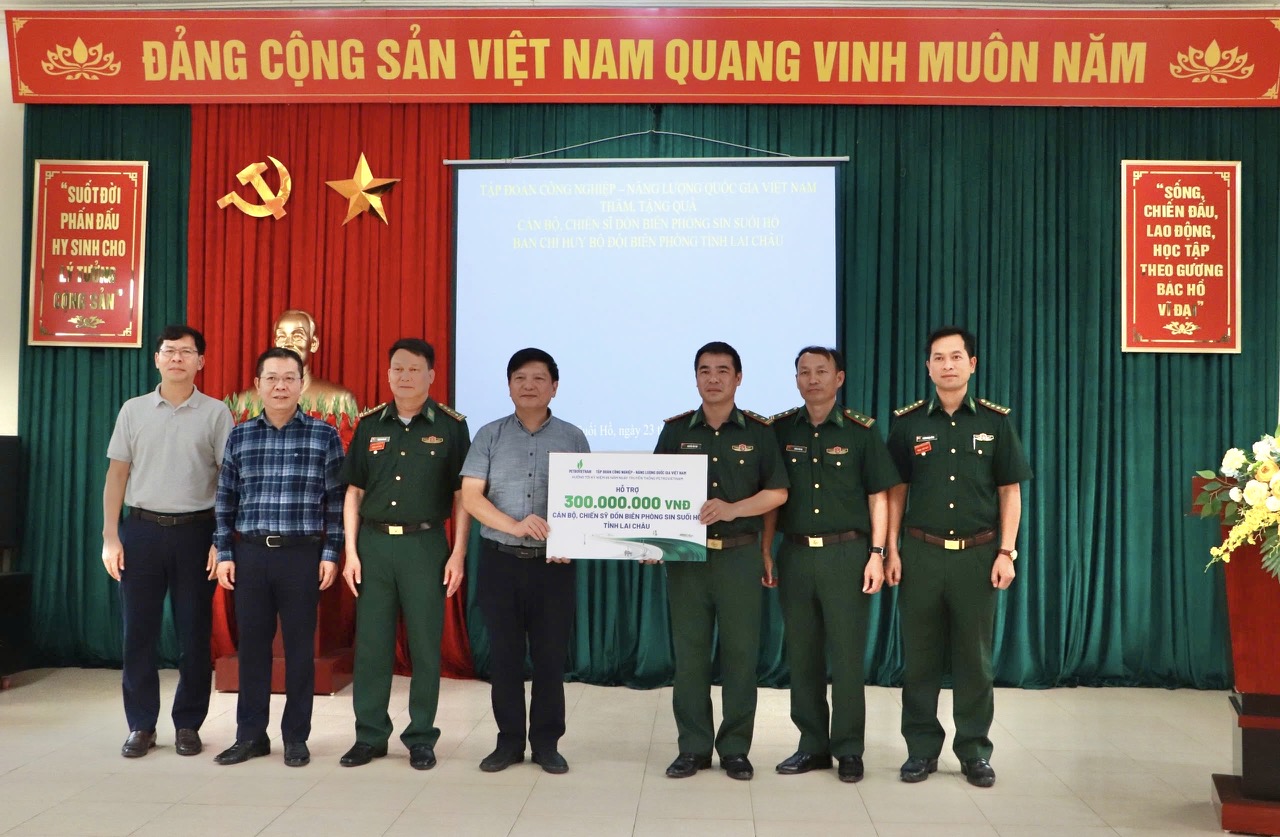 Nhân dịp này, đồng chí Lê Anh Chiến - Phó Trưởng Ban Tuyên giáo và Dân vận Đảng ủy Tập đoàn Công nghiệp - Năng lượng Quốc gia Việt Nam đã trao quà hỗ trợ của Tập đoàn Công nghiệp - Năng lượng Quốc gia Việt Nam cho cán bộ, chiến sĩ Đồn Biên phòng Sin Suối Hồ với số tiền 300 triệu đồng.