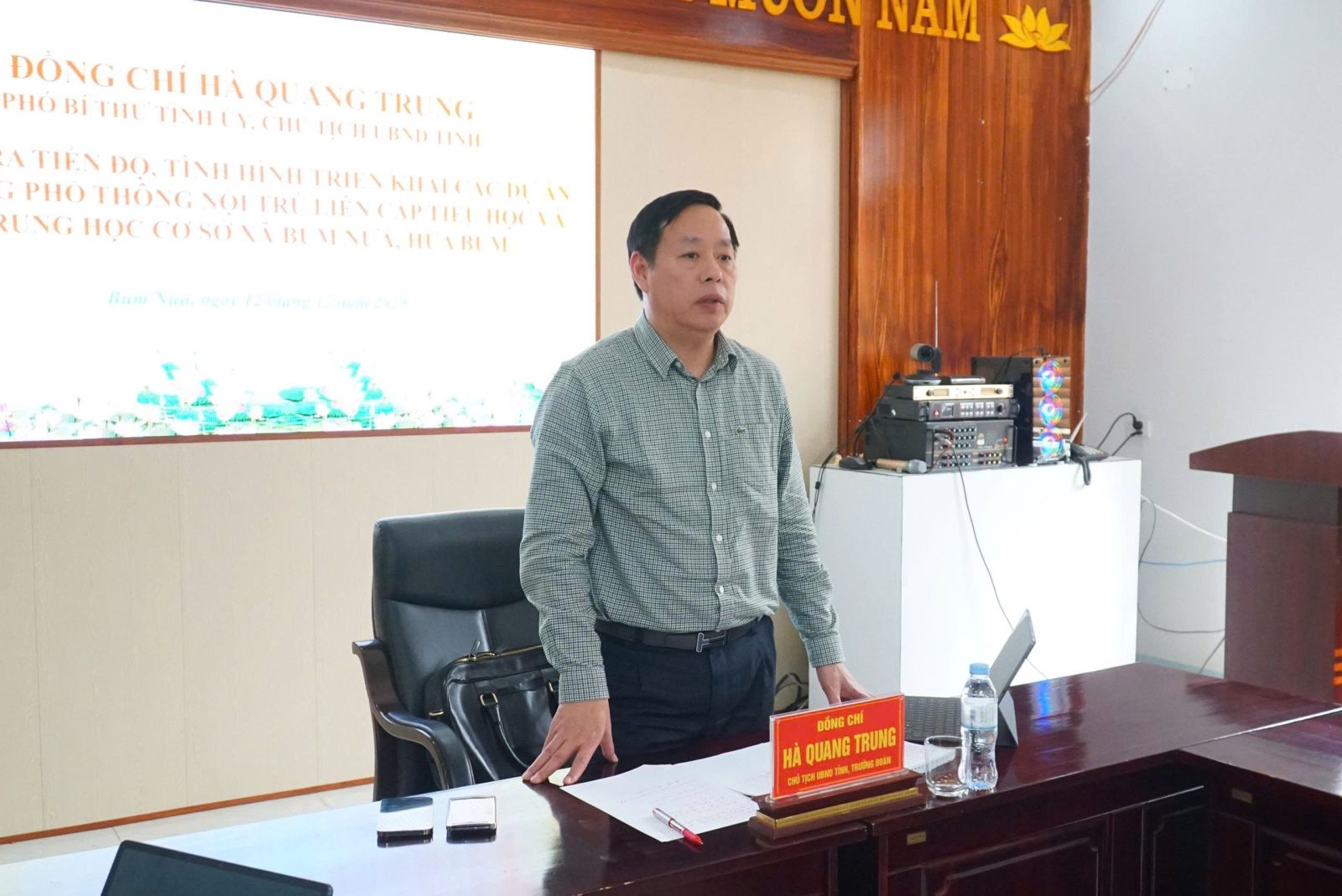 Theo đó, Chủ tịch UBND tỉnh Hà Quang Trung cùng Đoàn công tác đã kiểm tra tình hình triển khai Dự án đầu tư xây dựng Trường Phổ thông Nội trú liên cấp Tiểu học và Trung học cơ sở các xã: Hua Bum, Bum Nưa.