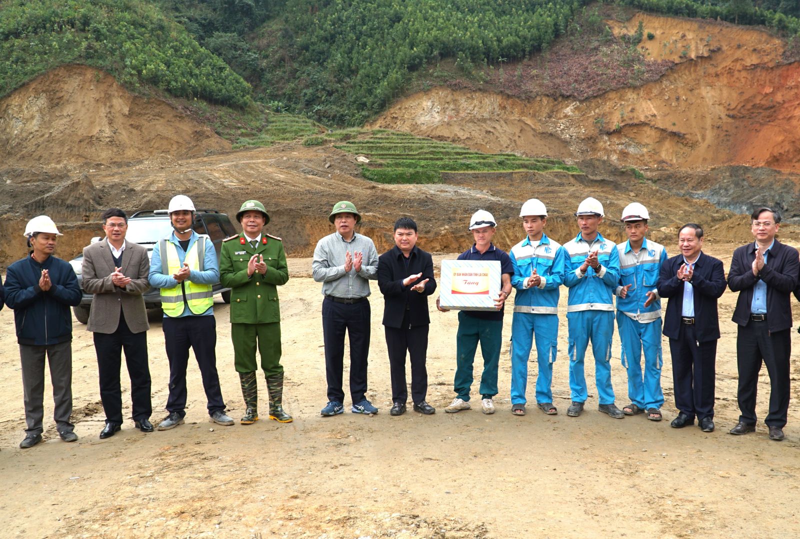 Tại các điểm kiểm tra, đồng chí Chủ tịch UBND tỉnh Hà Quang Trung và Đoàn công tác đã tặng quà động viên công nhân, đơn vị thi công đang thi công trên các công trường.