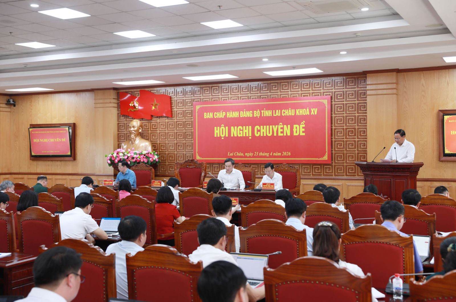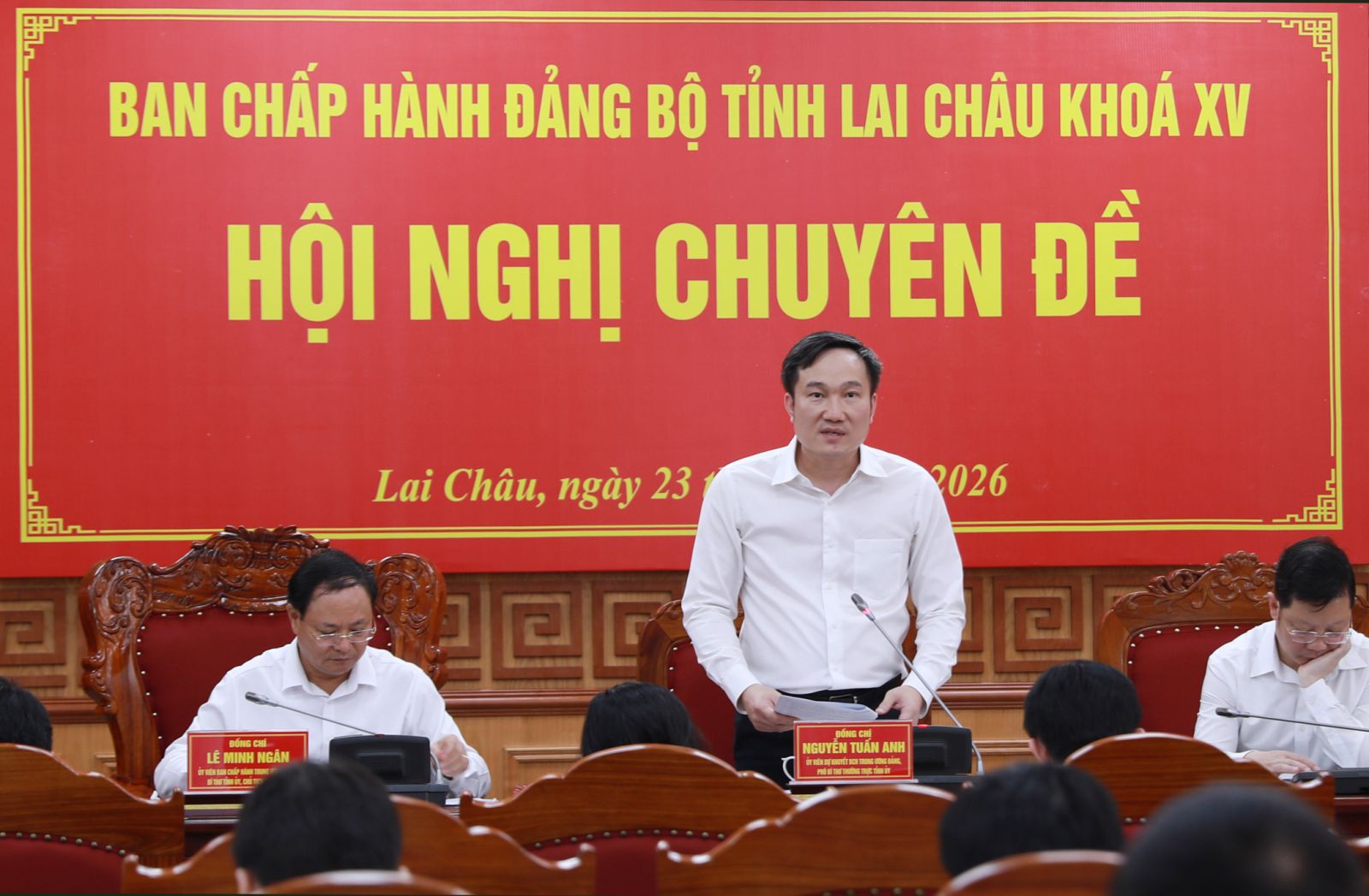 Sáng nay (23/4), Ban Chấp hành Đảng bộ tỉnh Lai Châu tổ chức Hội nghị chuyên đề cho ý kiến về một số nội dung quan trọng cho giai đoạn phát triển mới. Đồng chí Lê Minh Ngân - Ủy viên Ban Chấp hành Trung ương Đảng, Bí thư Tỉnh ủy, Chủ tịch HĐND tỉnh chủ trì Hội nghị.
