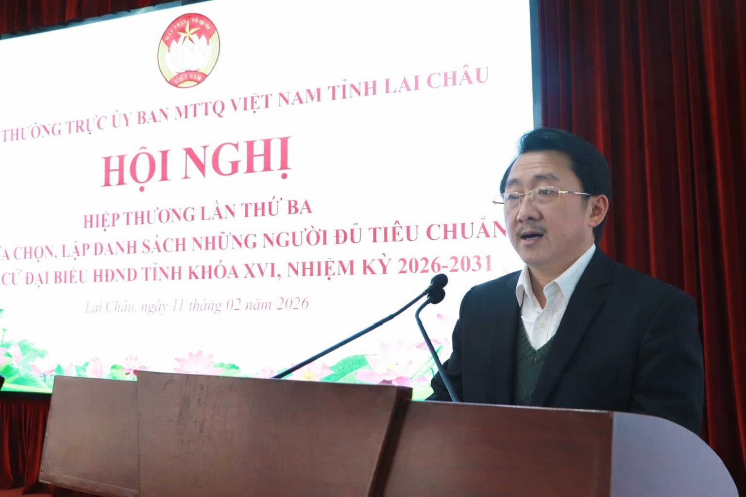 Chiều nay (11/2), Ban Thường trực Ủy ban Mặt trận Tổ quốc Việt Nam tỉnh tổ chức Hội nghị hiệp thương lần thứ ba để lựa chọn, lập danh sách những người đủ tiêu chuẩn ứng cử đại biểu HĐND tỉnh khóa XVI, nhiệm kỳ 2026 - 2031. Các đồng chí: Sùng A Hồ - Phó Bí thư Thường trực Tỉnh ủy, Chủ tịch Ủy ban Mặt trận Tổ quốc Việt Nam tỉnh; Tống Thanh Bình - Ủy viên Ban Thường vụ Tỉnh ủy, Phó Chủ tịch Thường trực Ủy ban Mặt trận Tổ quốc Việt Nam tỉnh đồng chủ trì Hội nghị.