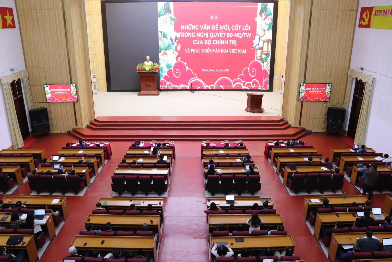 Tại Hội nghị, các đại biểu đã được nghe quán triệt, triển khai chương trình hành động các chuyên đề: Nội dung trọng tâm, cốt lõi và Chương trình hành động thực hiện Nghị quyết số 80-NQ/TW, ngày 07/01/2026 của Bộ Chính trị về phát triển văn hóa Việt Nam và Nghị quyết số 79-NQ/TW ngày 06/01/2026 của Bộ Chính trị về phát triển kinh tế Nhà nước.