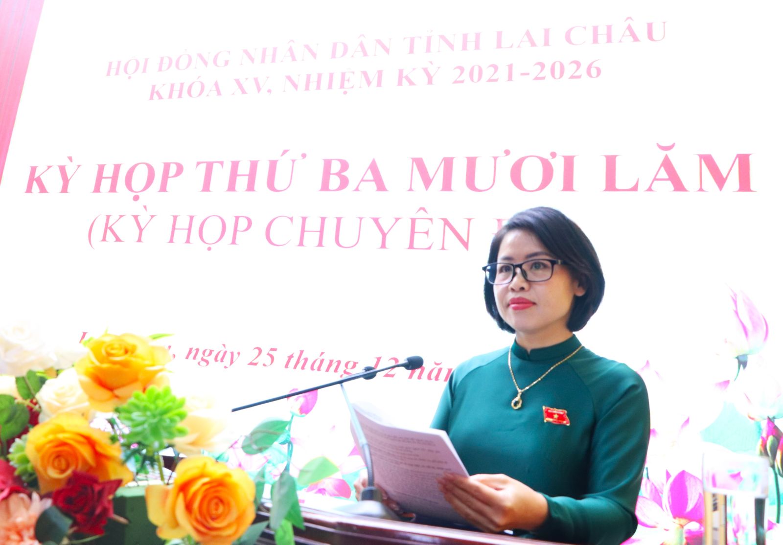 Tại Kỳ họp, đại biểu đã nghe các tờ trình và báo cáo thẩm tra dự thảo Nghị quyết về: Quy định phạm vi, nhiệm vụ, quyền hạn của Chủ tịch UBND cấp xã được ủy quyền cho công chức thuộc UBND cấp xã thực hiện trong lĩnh vực chứng thực trên địa bàn tỉnh Lai Châu; Quy định chính sách hỗ trợ cán bộ, công chức, viên chức về công tác tại các xã, phường khi thực hiện mô hình chính quyền địa phương 2 cấp trên địa bàn tỉnh Lai Châu; Nghị quyết thông qua Đề án kiện toàn tổ chức bộ máy, mô hình hoạt động và mức vốn điều lệ của Quỹ phát triển đất tỉnh Lai Châu; Bổ sung kinh phí để thực hiện các chế độ, chính sách và các nhiệm vụ phát sinh năm 2025; Quyết định chủ trương chuyển mục đích sử dụng rừng sang mục đích khác để thực hiện các dự án trên địa bàn tỉnh.