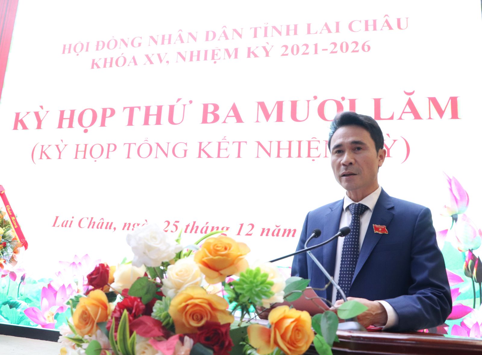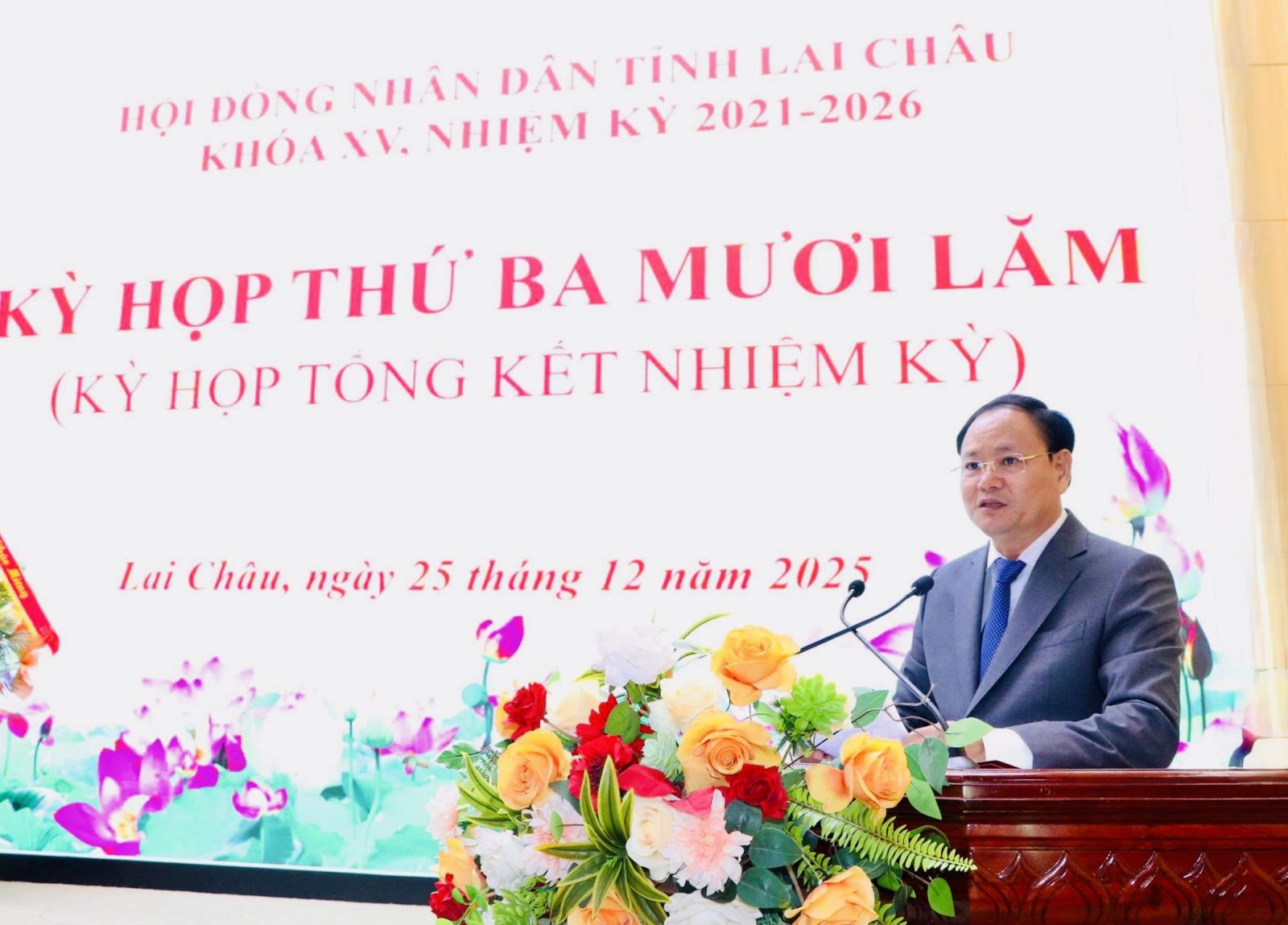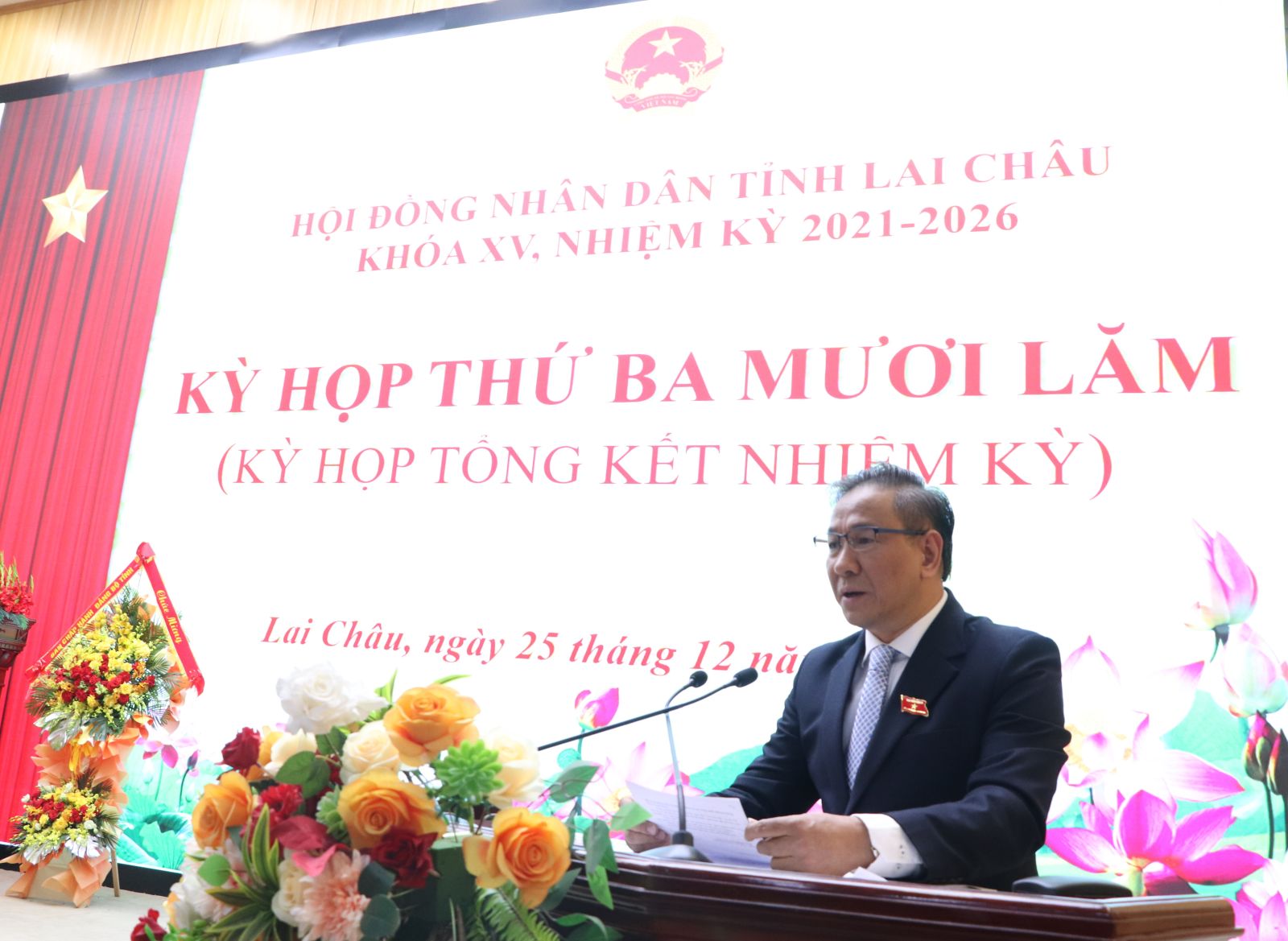Đồng chí Chủ tịch HĐND tỉnh cũng khẳng định: Kỳ họp thứ ba mươi lăm - kỳ họp kết thúc nhiệm kỳ HĐND tỉnh khóa XV đã thành công rất tốt đẹp. Thành công của kỳ họp là sự đánh dấu và khẳng định HĐND tỉnh đã hoàn thành trọng trách mà cử tri và Nhân dân các dân tộc trong tỉnh tin tưởng giao phó. HĐND tỉnh khóa XV tin tưởng rằng, với sự đồng thuận, ủng hộ của cử tri và Nhân dân trong tỉnh, HĐND khóa XVI sẽ tiếp tục kế thừa và phát huy những thành tựu đã đạt được của HĐND qua các nhiệm kỳ, đổi mới, nâng cao chất lượng, hiệu quả hoạt động, khẳng định vai trò là cơ quan quyền lực Nhà nước ở địa phương, góp phần xây dựng chính quyền địa phương hoạt động hiệu lực, hiệu quả, cùng Đảng bộ, chính quyền và Nhân dân các dân tộc trong tỉnh thực hiện thắng lợi Nghị quyết Đại hội Đảng bộ tỉnh lần thứ XV, xây dựng tỉnh Lai Châu phát triển xanh, nhanh và bền vững, cùng cả nước vững bước trong kỷ nguyên mới, kỷ nguyên phát triển giàu mạnh và hùng cường của dân tộc Việt Nam.