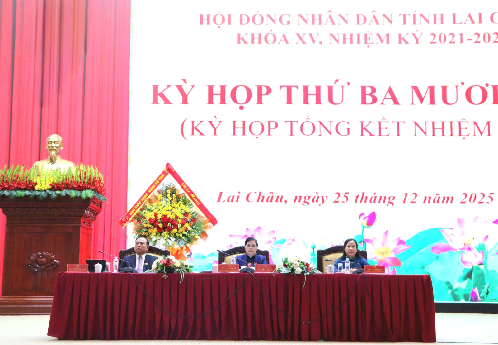 Tiếp tục Chương trình của Kỳ họp thứ ba mươi lăm, chiều nay (25/12), HĐND tỉnh Lai Châu khoá XV, nhiệm kỳ 2021 - 2026 tiến hành Tổng kết, đánh giá hoạt động của HĐND tỉnh khóa XV, nhiệm kỳ 2021 - 2026. Các đồng chí: Giàng Páo Mỷ - Ủy viên Ban Chấp hành Trung ương Đảng, Chủ tịch HĐND tỉnh, Trưởng đoàn Đại biểu Quốc hội tỉnh; Tẩn Thị Quế - Phó Chủ tịch HĐND tỉnh; Nguyễn Sỹ Cảnh - Phó Chủ tịch HĐND tỉnh chủ trì Kỳ họp.