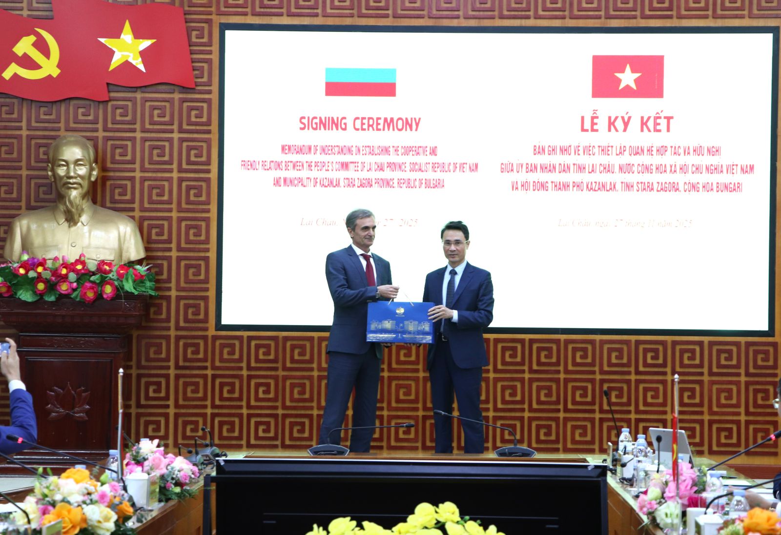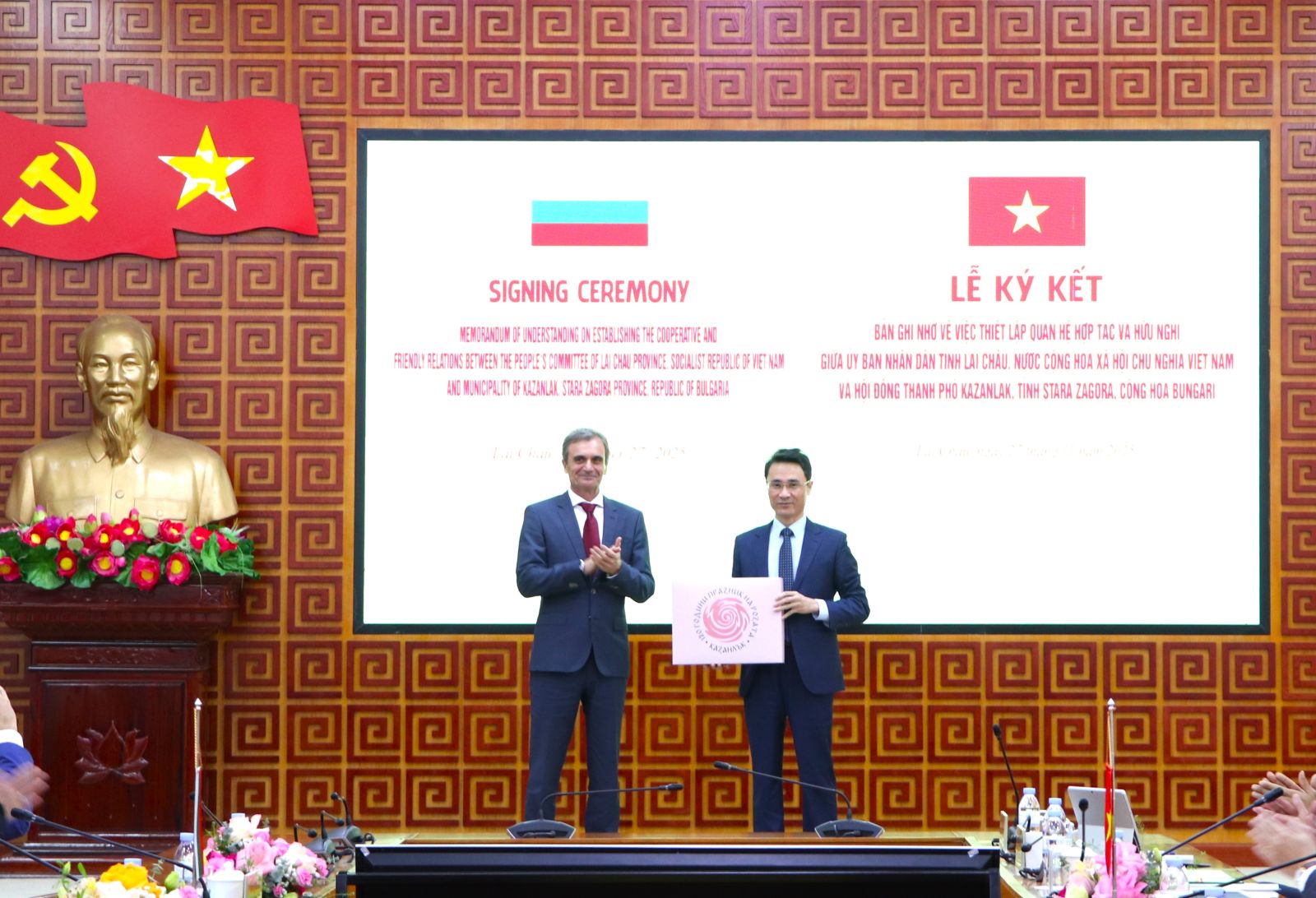 Sau khi thảo luận các nội dung, các đồng chí lãnh đạo hai Bên đã thực hiện ký kết Bản ghi nhớ về việc thiết lập quan hệ hợp tác hữu nghị giữa UBND tỉnh Lai Châu, nước Cộng hòa xã hội chủ nghĩa Việt Nam và Hội đồng thành phố Kazanlak, tỉnh Stara Zagora, Cộng hòa Bulgaria.