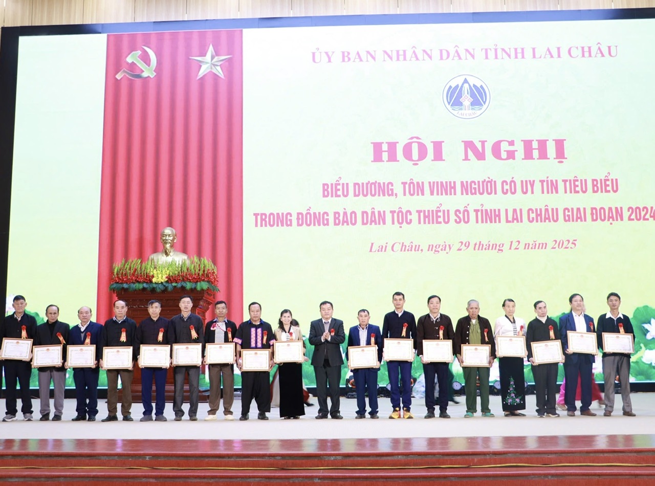 Nhân dịp này, Chủ tịch UBND tỉnh Lai Châu tặng Bằng khen cho 38 cá nhân; Sở Dân tộc và Tôn giáo tặng Giấy khen cho 20 cá nhân là người có uy tín tiêu biểu, có thành tích xuất sắc đóng góp trong phát triển kinh tế - xã hội, bảo vệ an ninh trật tự ở cơ sở giai đoạn 2024 - 2025. Đồng thời, tặng quà cho người uy tín tiêu biểu về dự Hội nghị.