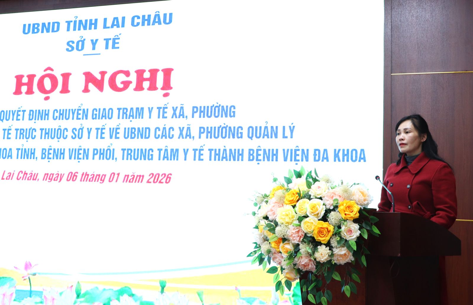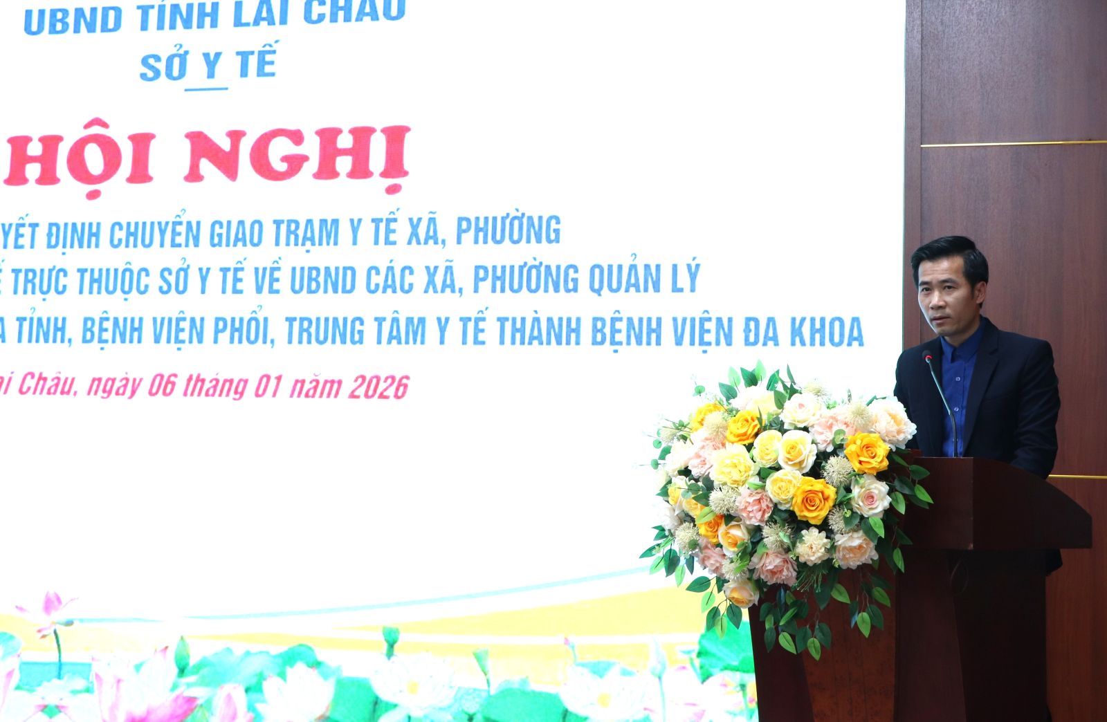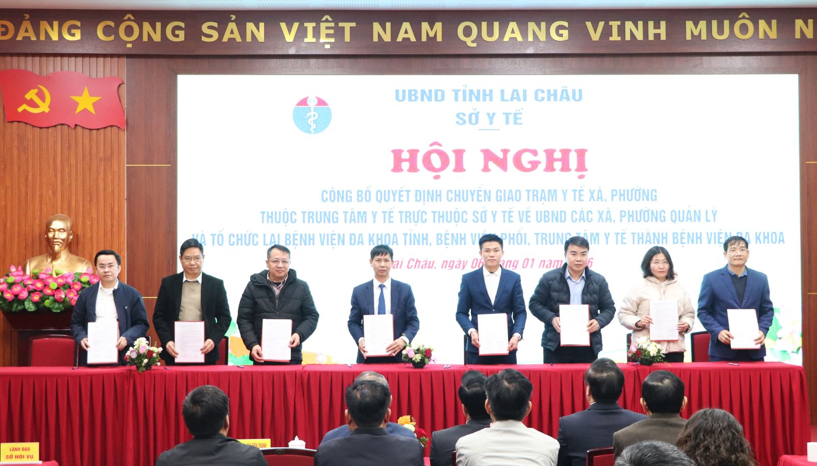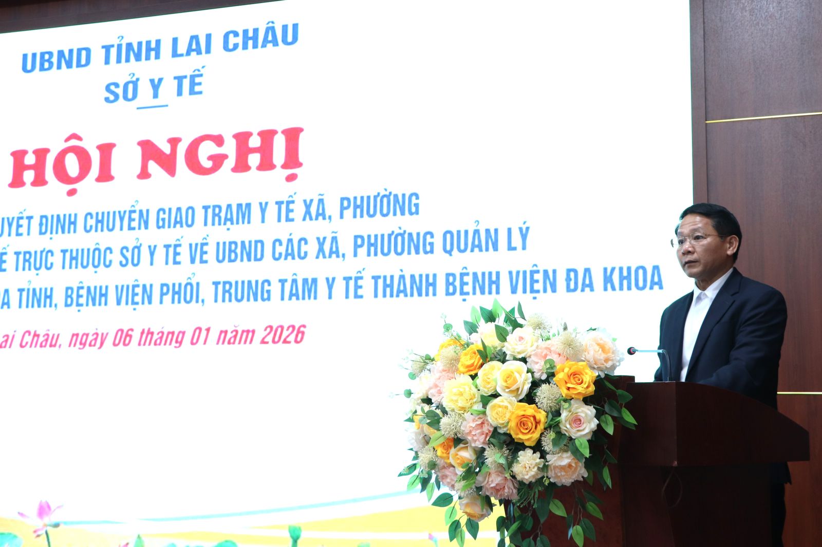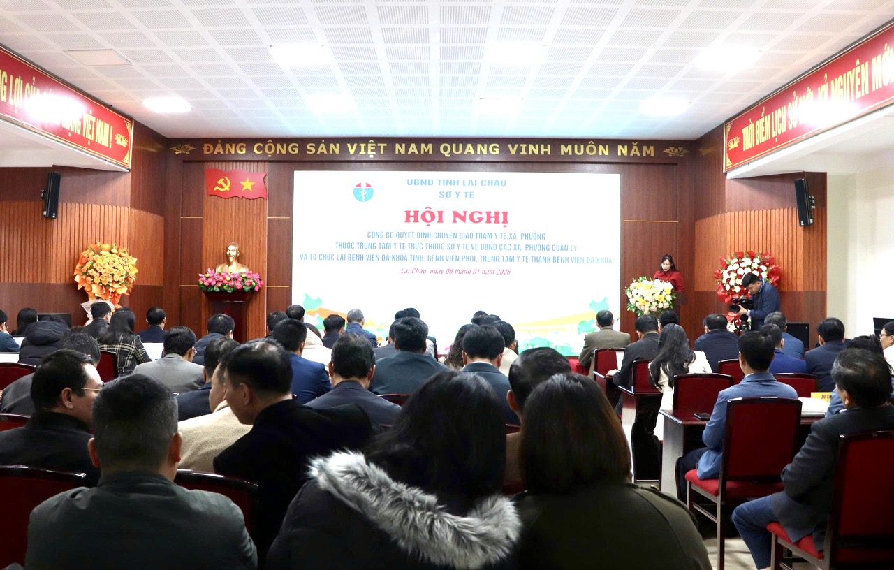 Chiều nay (6/1), Sở Y tế tỉnh Lai Châu tổ chức Hội nghị công bố Quyết định chuyển giao Trạm Y tế xã, phường thuộc Trung tâm Y tế trực thuộc Sở Y tế về UBND các xã, phường quản lý và tổ chức lại Bệnh viện Đa khoa tỉnh, Bệnh viện Phổi, Trung tâm Y tế thành Bệnh viện Đa khoa. Đồng chí Tống Thanh Hải - Ủy viên Ban Thường vụ Tỉnh ủy, Phó Chủ tịch Thường trực UBND tỉnh dự và phát biểu chỉ đạo.