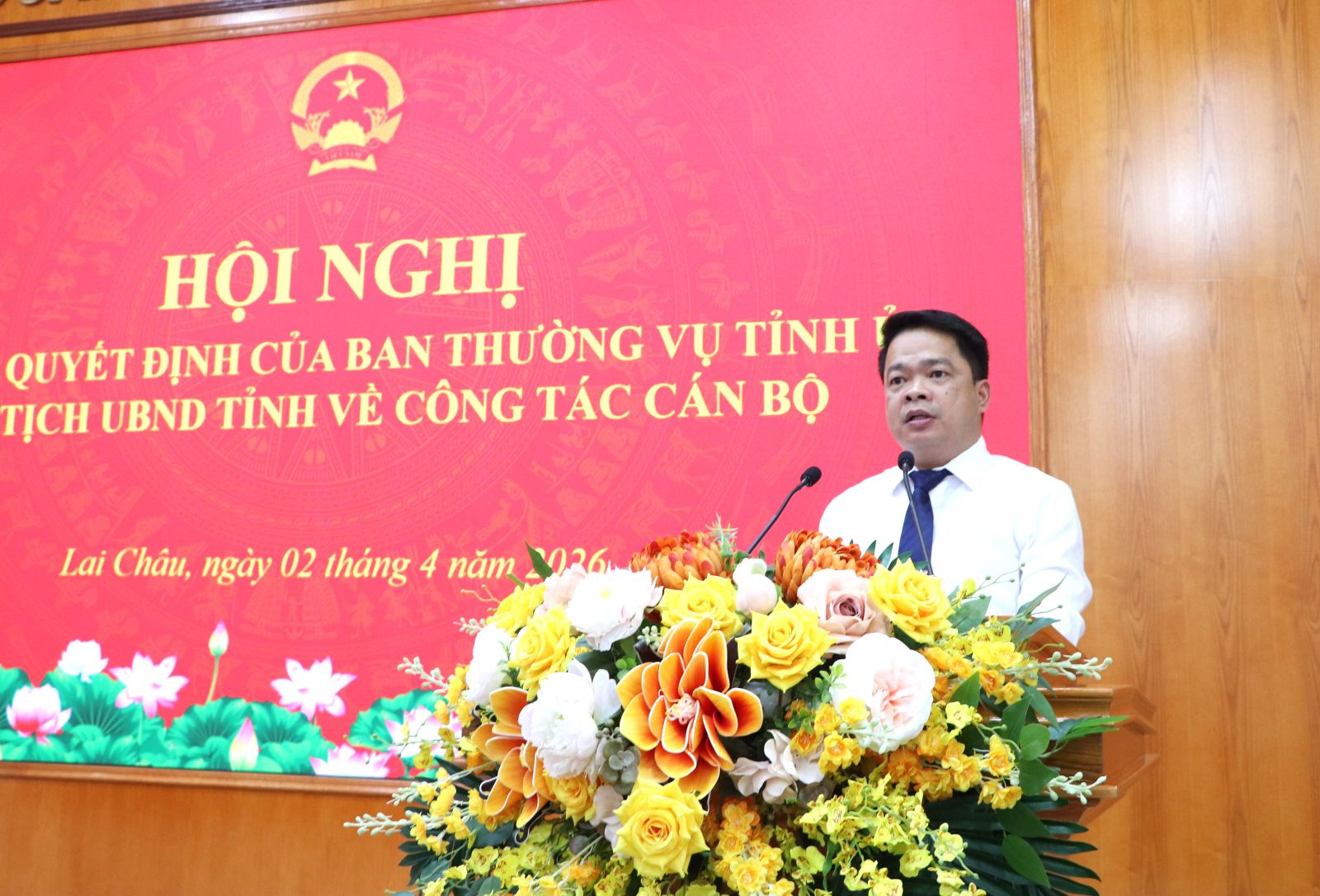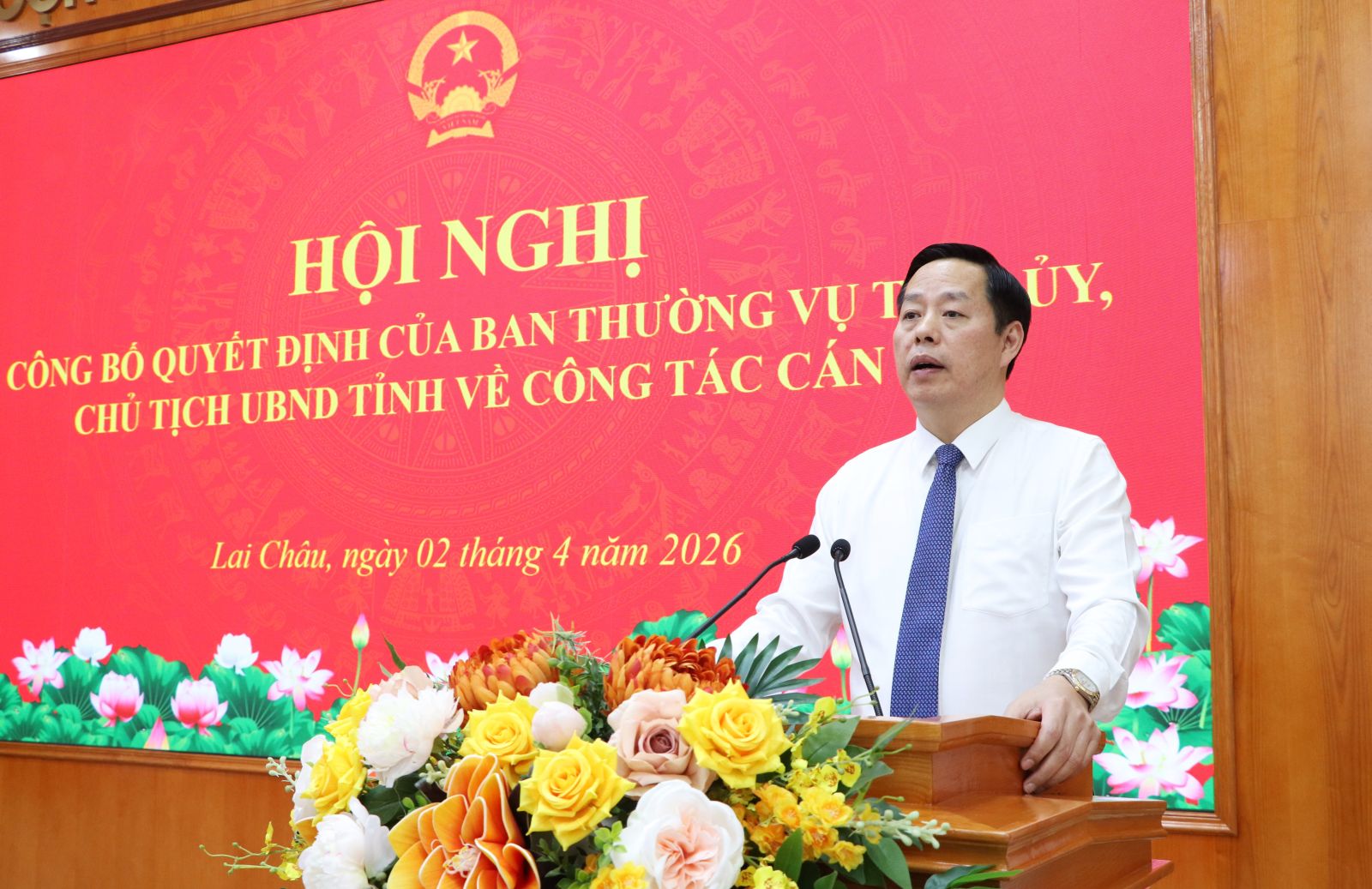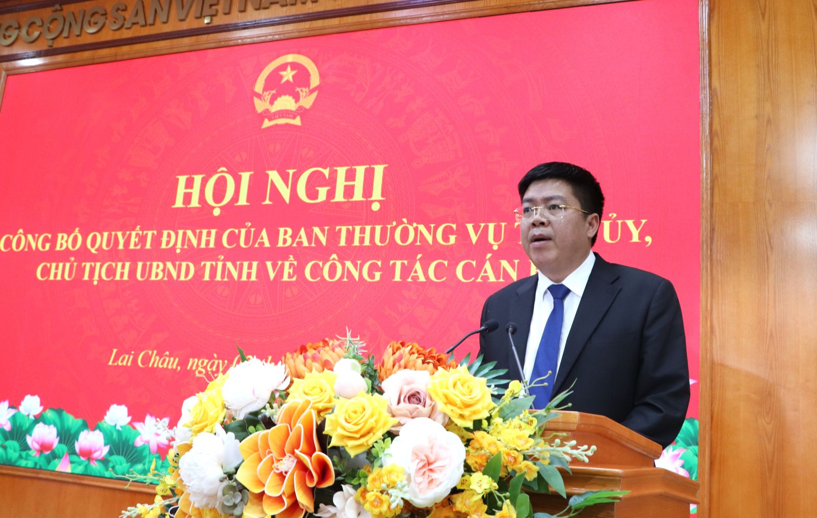 Chiều nay (2/4), tỉnh Lai Châu tổ chức Hội nghị công bố quyết định của Ban Thường vụ Tỉnh ủy, Chủ tịch UBND tỉnh về công tác cán bộ. Đồng chí Hà Quang Trung - Phó Bí thư Tỉnh ủy, Chủ tịch UBND tỉnh dự trao Quyết định và phát biểu giao nhiệm vụ.