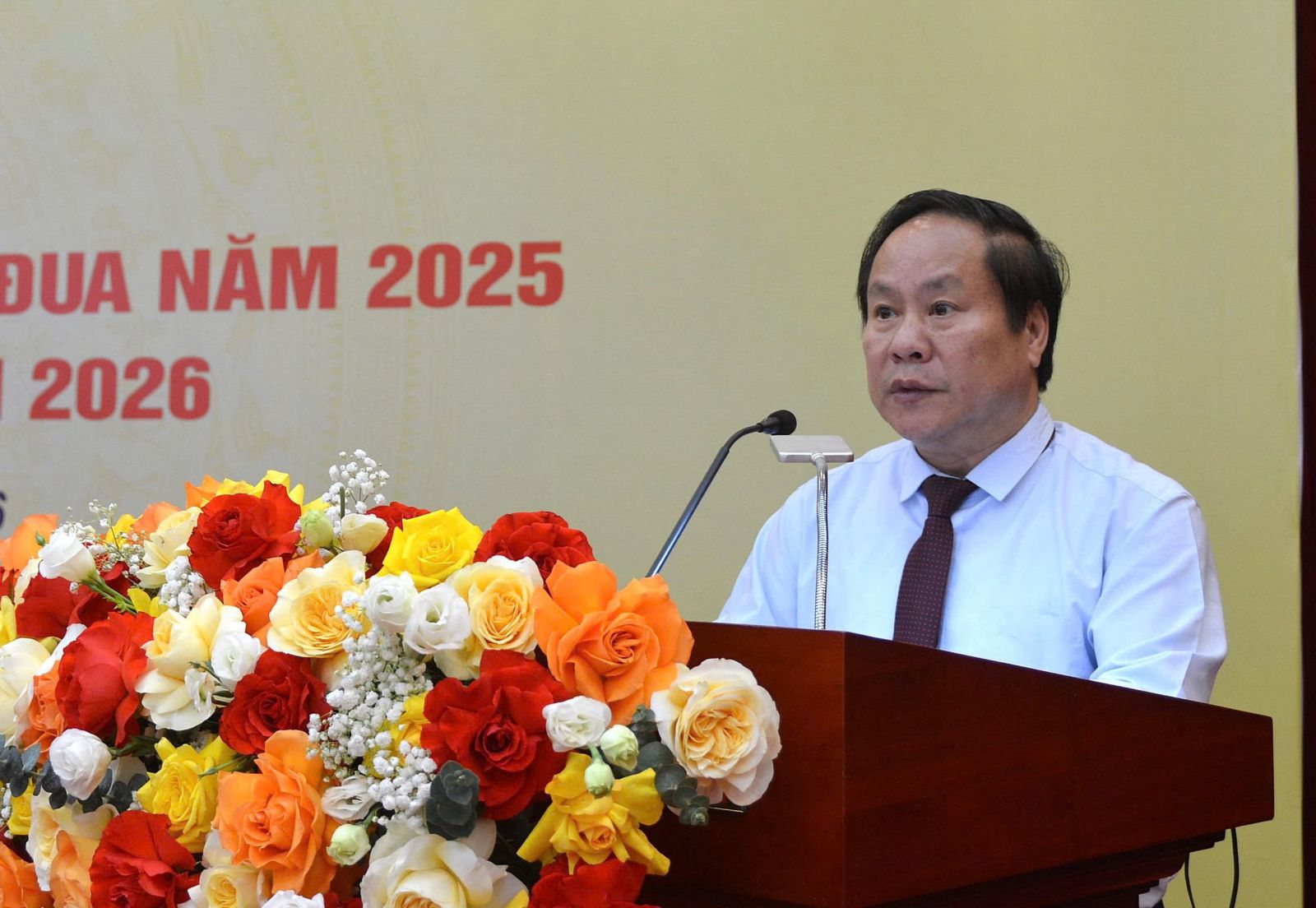 Đồng chí Phó Chủ tịch Thường trực UBND tỉnh Lai Châu bày tỏ quyết tâm hiện thực hóa mục tiêu "Kỷ nguyên vươn mình của dân tộc" thông qua các giải pháp thi đua thiết thực: Hoàn thành thắng lợi mục tiêu tăng trưởng toàn vùng trên 8%; quyết tâm thực hiện thắng lợi Nghị quyết Đại hội Đảng bộ các tỉnh nhiệm kỳ 2025-2030; đẩy mạnh chuyển đổi số và tiếp tục tinh gọn bộ máy để nâng cao năng lực cạnh tranh; thu hẹp khoảng cách mức sống và xây dựng hệ thống chính trị vững chắc tại vùng biên giới.
