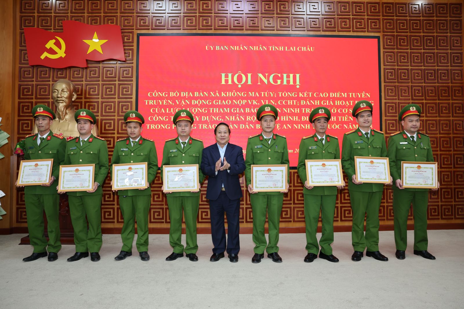 Nhân dịp này, Chủ tịch UBND tỉnh Lai Châu tặng Bằng khen cho 1 tập thể, 3 cá nhân có thành tích xuất sắc trong tham mưu, triển khai xây dựng lực lượng tham gia bảo vệ an ninh ở cơ sở và công tác xây dựng, nhân rộng mô hình, điển hình tiên tiến trong Phong trào Toàn dân bảo vệ an ninh Tổ quốc năm 2025; 8 cá nhân có thành tích xuất sắc, đột xuất trong thực hiện Chuyên án 924V đấu tranh, triệt phá đường dây mua bán, vận chuyển, tàng trữ trái phép vũ khí quân dụng và cao điểm tuyên truyền, thu hồi, vận động toàn dân giao nộp vũ khí, vật liệu nổ, công cụ hỗ trợ.