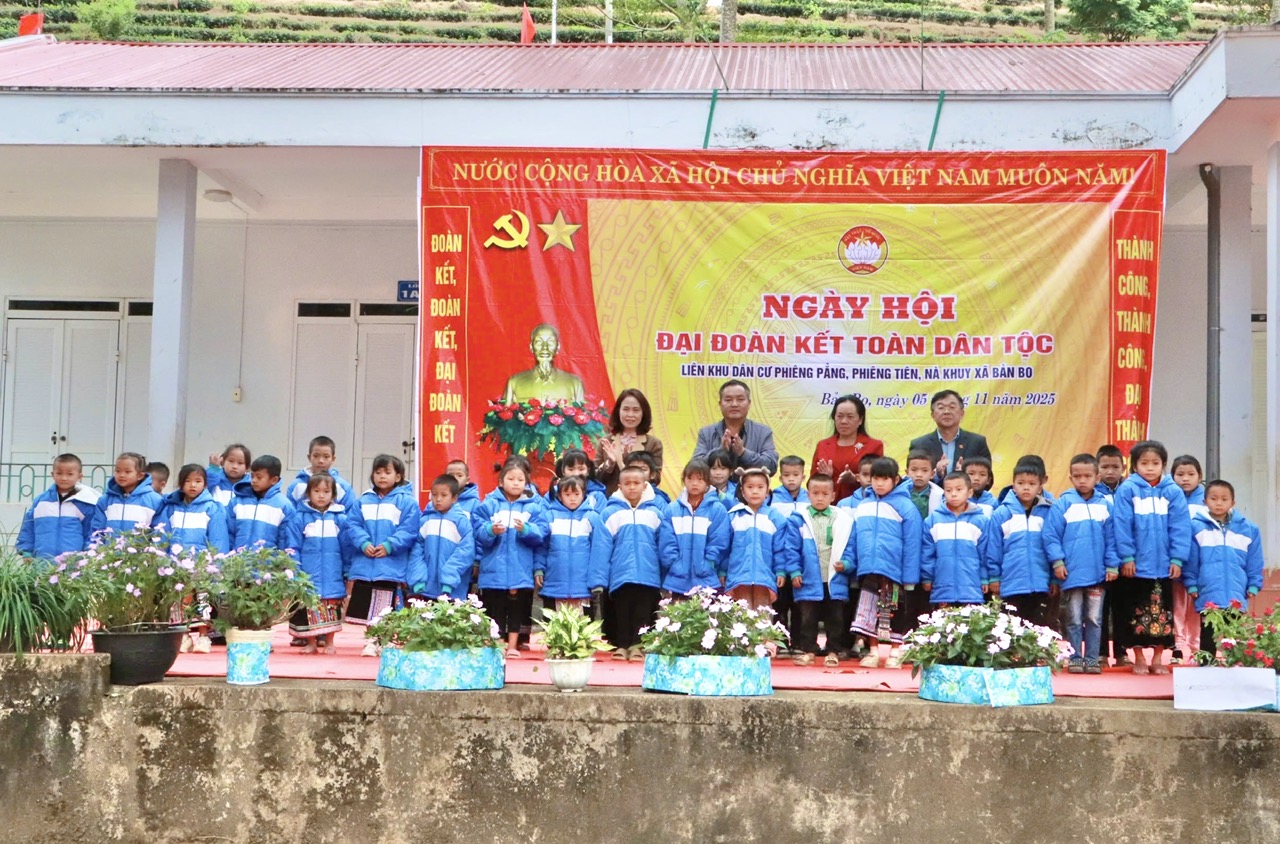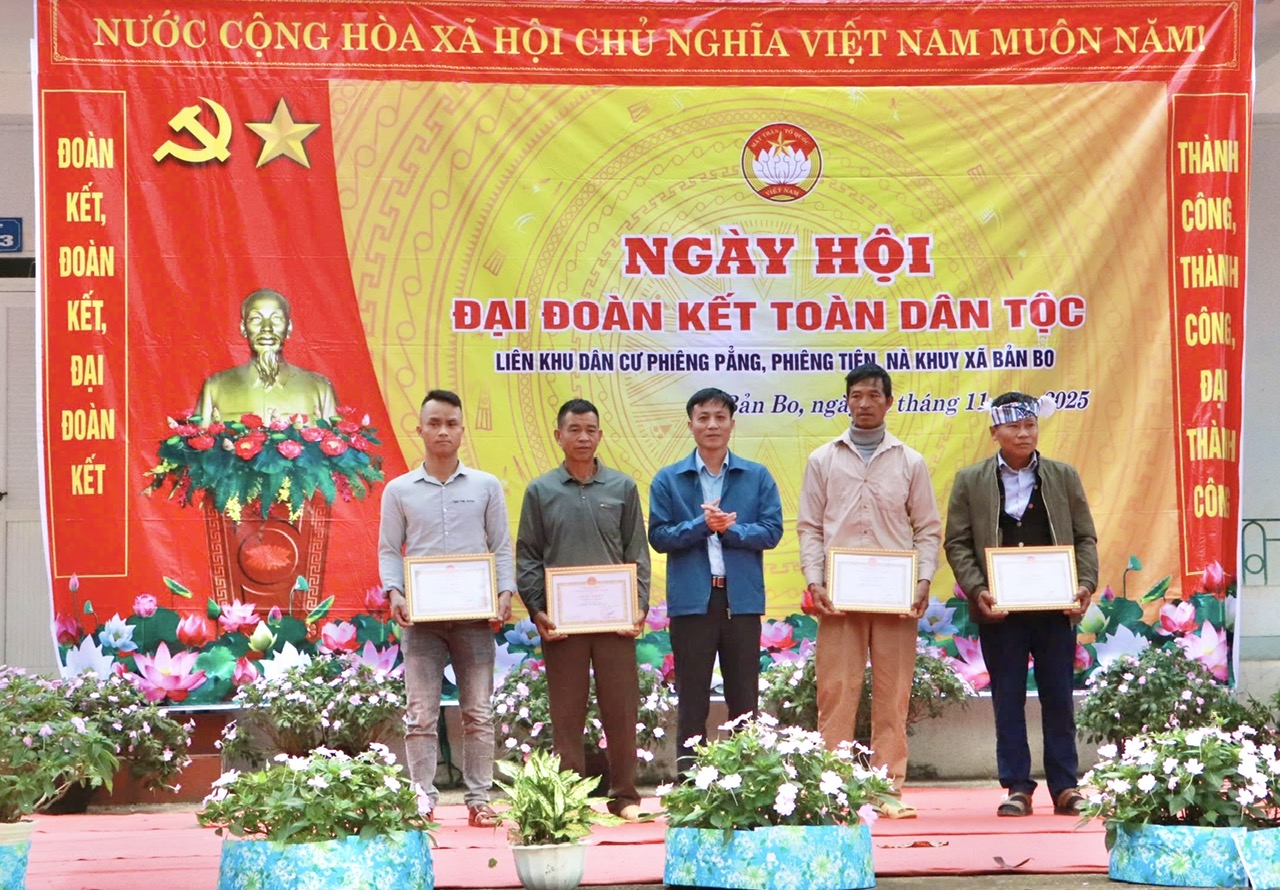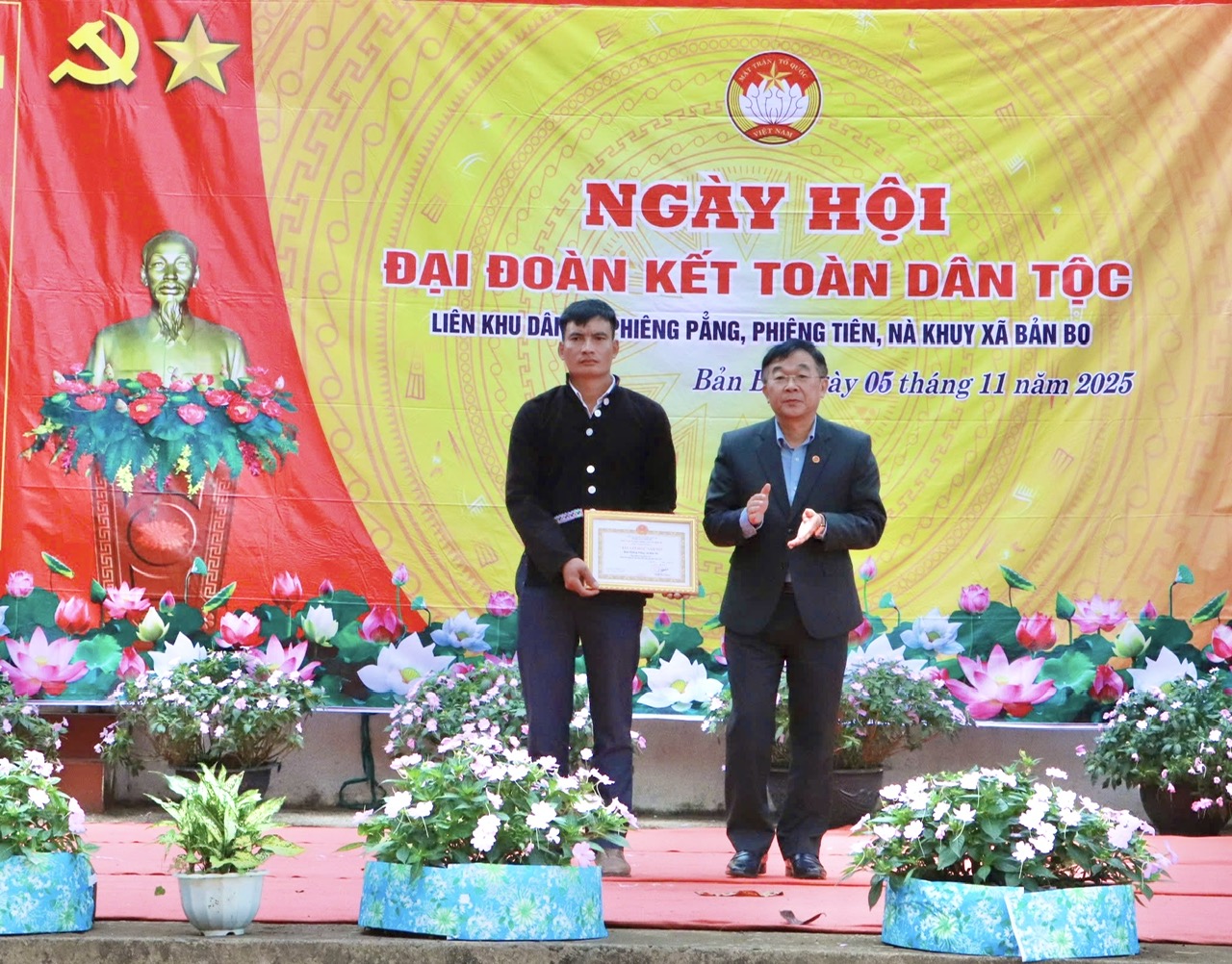 Nhân dịp này, thay mặt Tỉnh ủy, HĐND, UBND, Ủy ban Mặt trận Tổ quốc Việt Nam tỉnh, đồng chí Giàng A Tính - Ủy viên Ban Thường vụ Tỉnh ủy, Phó Chủ tịch UBND tỉnh đã tặng quà động viên cho đại diện liên bản Phiêng Pẳng - Phiêng Tiên - Nà Khuy. Xã Bản Bo tặng danh hiệu Bản văn hóa cho Phiêng Pẳng; tặng Giấy khen cho 4 hộ gia đình có thành tích xuất sắc trong Phong trào “Toàn dân đoàn kết xây dựng đời sống văn hóa” năm 2024 trên địa bàn liên bản Phiêng Pẳng - Phiêng Tiên - Nà Khuy; công nhận danh hiệu gia đình văn hóa cho 159 hộ gia đình văn hóa trên địa bàn liên bản.