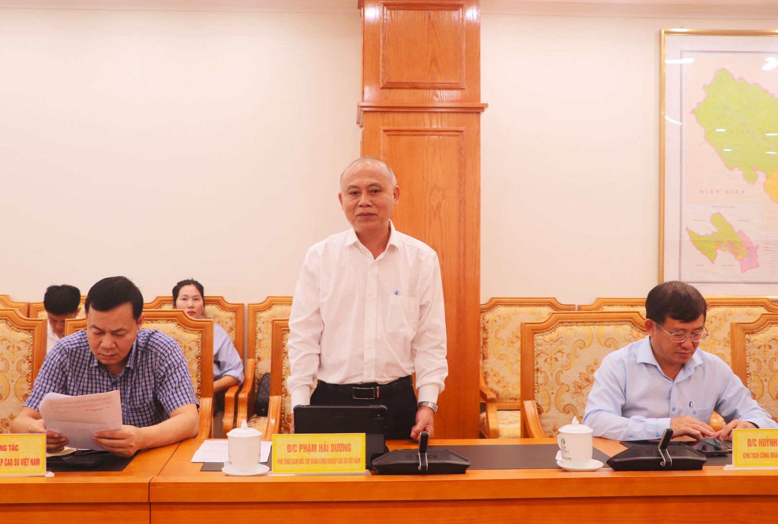 Phát biểu tại buổi làm việc, ông Phạm Hải Dương - Phó Tổng Giám đốc Tập đoàn đã khẳng định lại những kết quả của các Công ty cao su trên địa bàn tỉnh Lai Châu, trong việc ổn định sản xuất, kinh doanh, chăm lo đời sống người lao động, đặc biệt là người lao động địa phương. Ông nhấn mạnh: Tập đoàn luôn đặt người lao động làm trung tâm trong mọi hoạt động, từ chính sách tiền lương, phúc lợi đến đào tạo và nâng cao chất lượng sống và phấn đấu để thu nhập của công nhân cao su Lai Châu tiệm cận mức bình quân của công nhân toàn Tập đoàn.