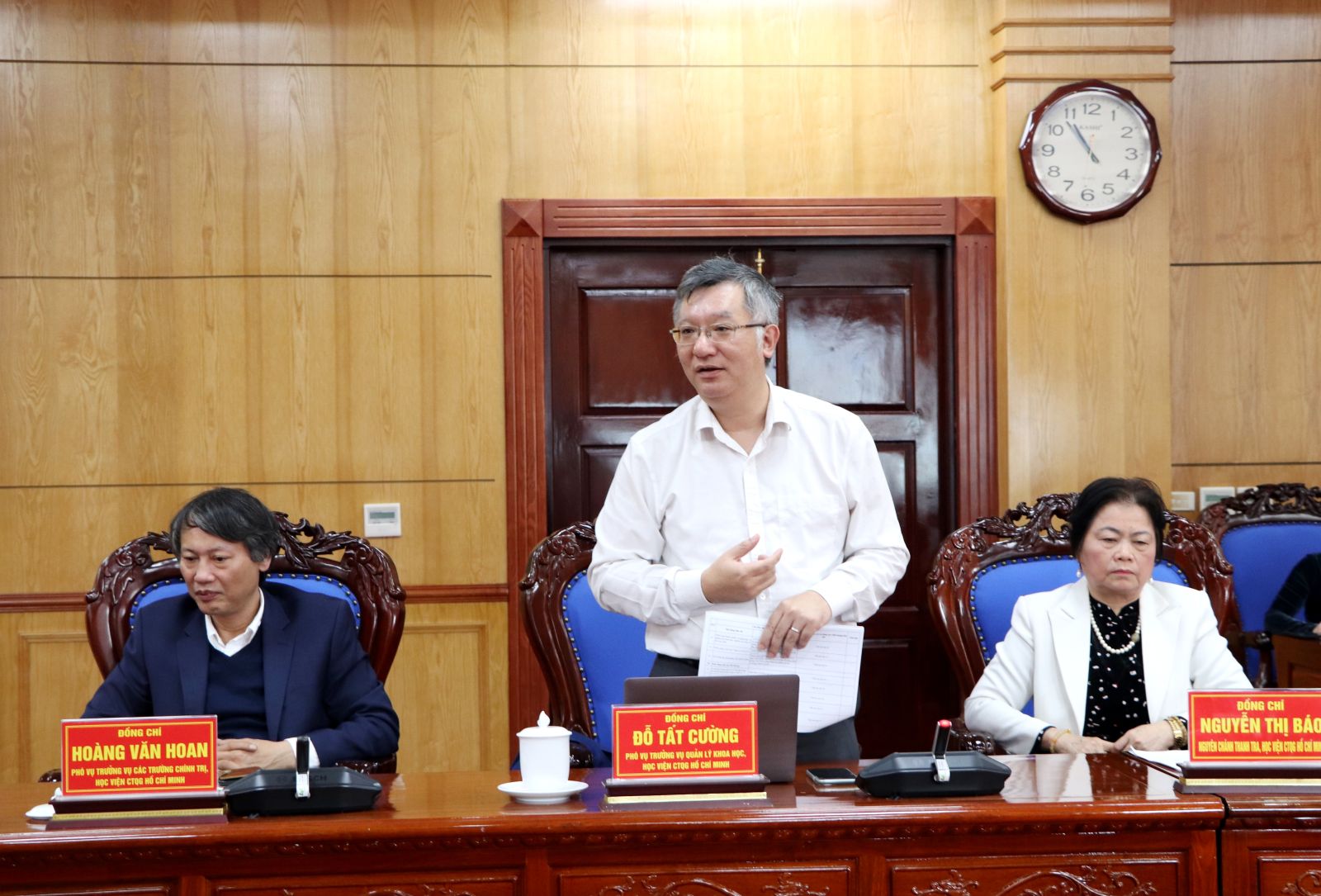 Phát biểu kết luận buổi làm việc, PGS, TS Dương Trung Ý - Phó Giám đốc Học viện nhấn mạnh, thời gian qua, tỉnh Lai Châu đã rất quan tâm đến công tác đào tạo, bồi dưỡng cán bộ và quyết tâm xây dựng Trường Chính trị chuẩn. Đồng chí Phó Giám đốc Học viện đề nghị, Tỉnh ủy Lai Châu tiếp tục trực tiếp lãnh, chỉ đạo trong đẩy mạnh công tác đào tạo, bồi dưỡng cán bộ đáp ứng yêu cầu nhiệm vụ trong tình hình mới, góp phần thực hiện thắng lợi nhiệm vụ chính trị của địa phương; thực hiện tốt việc xây dựng kế hoạch đào tạo, bồi dưỡng gắn với quy hoạch, bố trí, sử dụng cán bộ; quyết tâm xây dựng Trường Chính trị tỉnh Lai Châu đạt Chuẩn mức 1 vào năm 2026 và tích cực phấn đấu Chuẩn mức 2 sớm hơn so với dự kiến; quan tâm đào tạo, bồi dưỡng nâng cao trình độ, kỹ năng nghiệp vụ, nghiên cứu khoa học cho đội ngũ giảng viên Trường Chính trị tỉnh; đẩy mạnh thực hiện nhiệm vụ nghiên cứu khoa học...