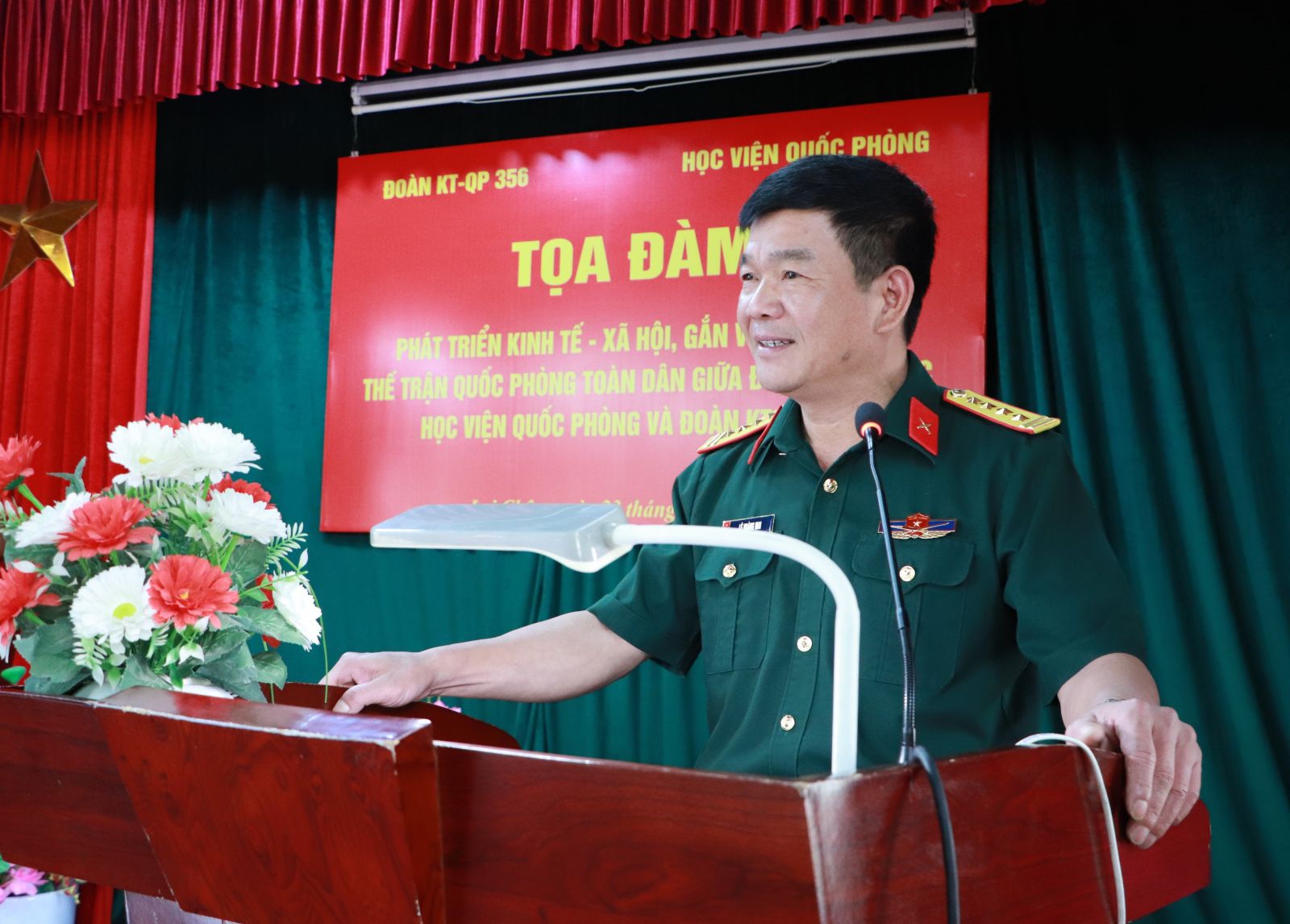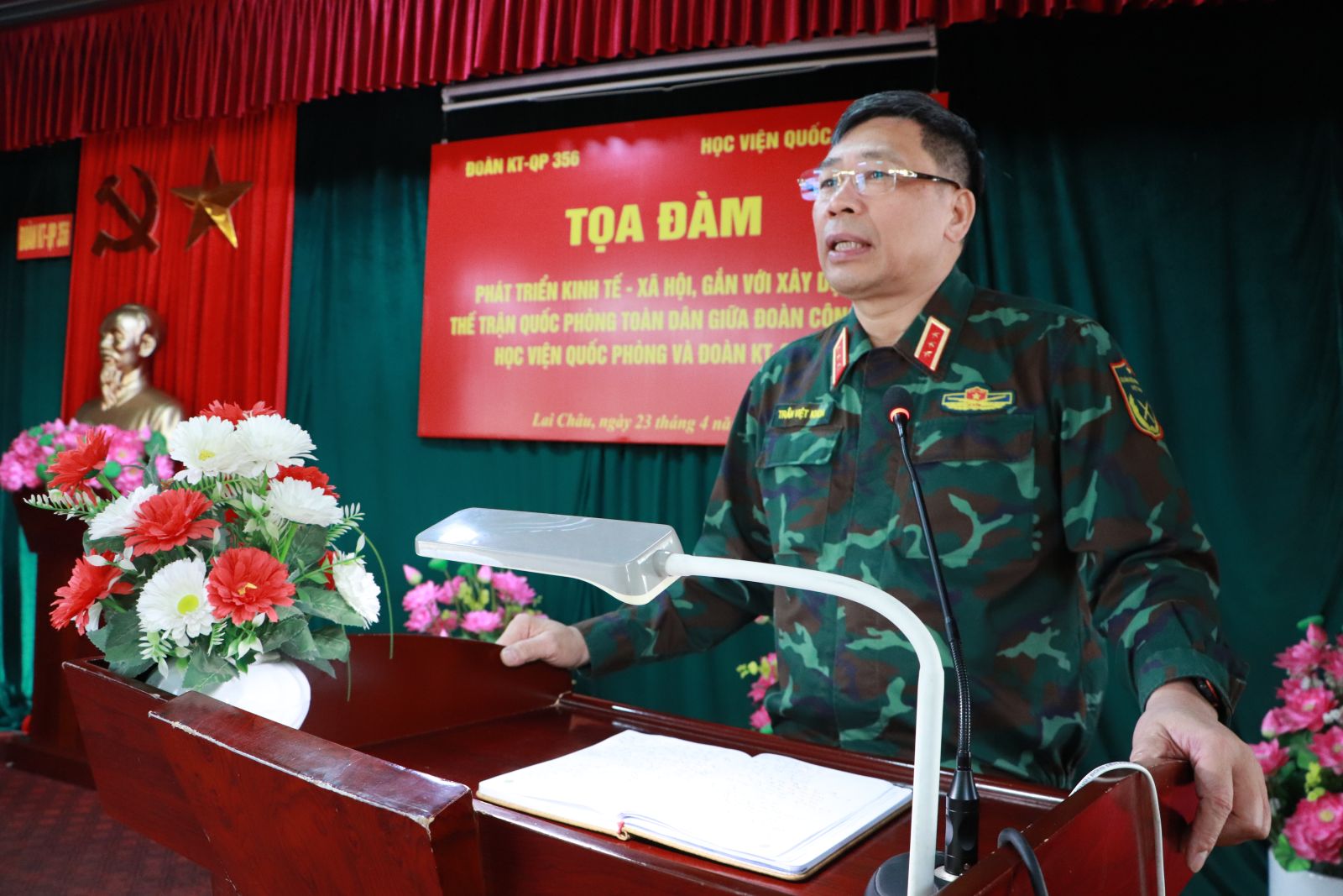 Phát biểu kết luận Tọa đàm, đồng chí Thượng tướng Trần Việt Khoa - Ủy viên Ban Chấp hành Trung ương Đảng, Giám đốc Học viện Quốc phòng chia sẻ với những khó khăn của vùng biên giới Lai Châu và đánh giá cao những kết quả mà Đoàn KT-QP 356 đã đạt được trong thời gian qua. Đồng chí đề nghị, Đoàn KT-QP 356 cần tiếp tục bám sát địa bàn thực hiện tốt mọi nhiệm vụ chính trị được giao, nhất là giúp Nhân dân phát triển kinh tế, nâng cao đời sống; làm tốt công tác dân vận khéo, tăng cường khối đại đoàn kết các dân tộc, thắt chặt tinh thần đoàn kết quân - dân; phối hợp chặt chẽ với cấp ủy, chính quyền địa phương, các lực lượng trên địa bàn, đưa kinh tế - xã hội vùng biên ngày càng phát triển gắn với đảm bảo quốc phòng, an ninh ngày càng vững chắc...