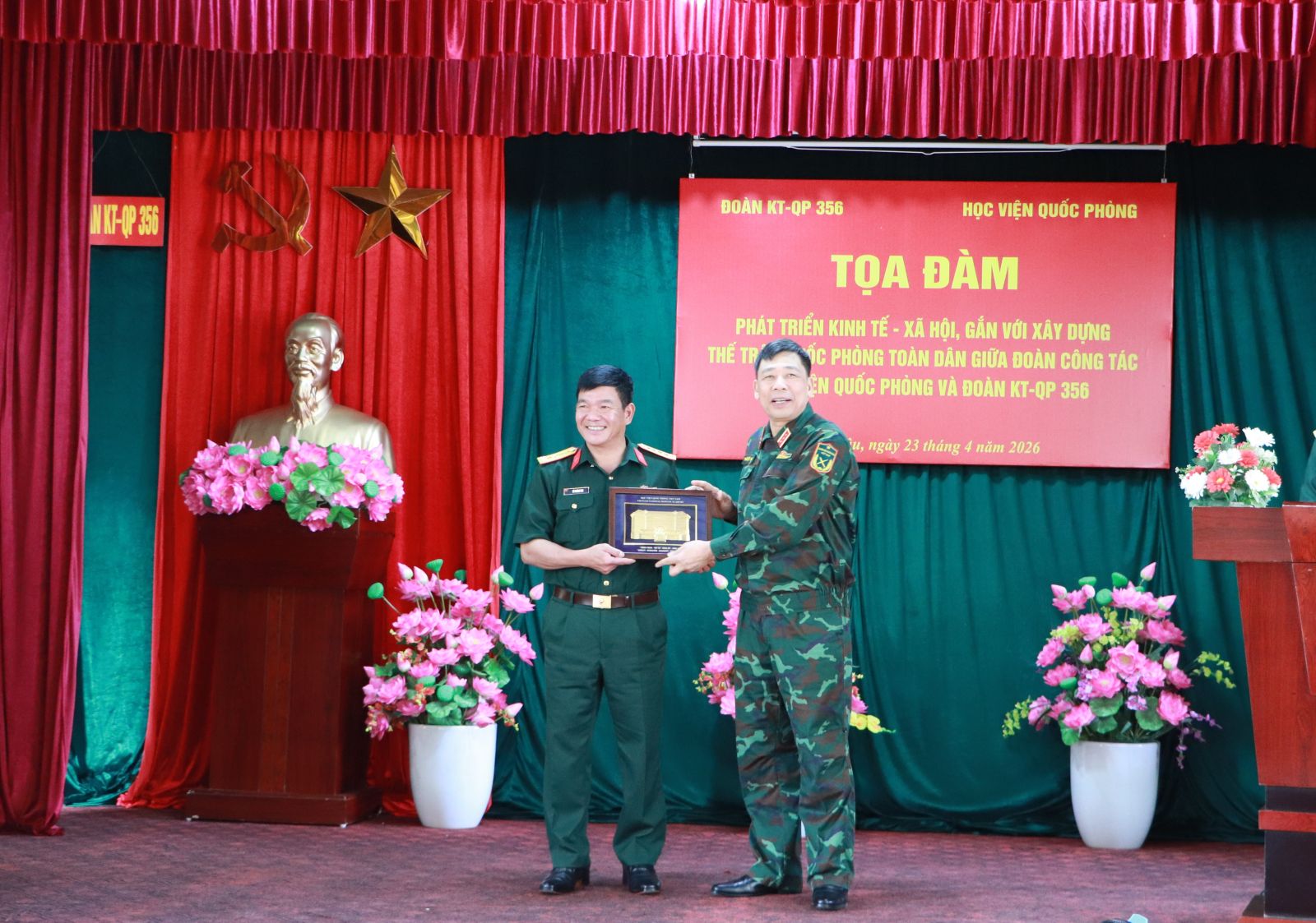 Sáng nay (23/4), Học viện Quốc phòng phối hợp với Đoàn Kinh tế - Quốc phòng (KT- QP) 356 - Quân khu 2 tổ chức Tọa đàm Phát triển kinh tế - xã hội gắn với xây dựng thế trận quốc phòng toàn dân. Các đồng chí: Thượng tướng Trần Việt Khoa - Ủy viên Ban Chấp hành Trung ương Đảng, Giám đốc Học viện Quốc phòng - Trưởng đoàn công tác Học viện Quốc phòng; Đại tá Lê Hoàng Mai - Bí thư Đảng ủy, Chính ủy Đoàn KT-QP 356 chủ trì buổi Tọa đàm.