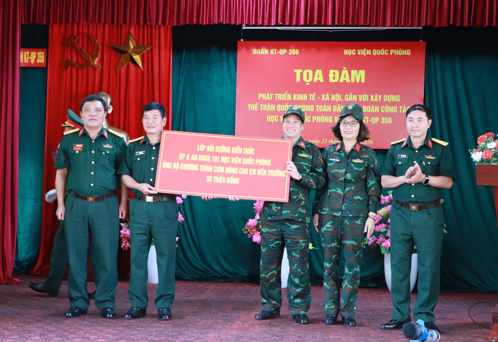 Nhân dịp này, Học viện Quốc phòng đã tặng quà Đoàn KT-QP 356; Tập thể Lớp Bồi dưỡng kiến thức quốc phòng, an ninh, khóa 101; Đoàn cán bộ của Bộ Ngoại giao; Đoàn cán bộ của Bộ Quốc phòng (Lớp Bồi dưỡng kiến thức quốc phòng, an ninh, khóa 101) ủng hộ Chương trình “Cơm nóng cho em tới trường” do Đoàn KT-QP 356 đang triển khai tổng trị giá 130 triệu đồng...