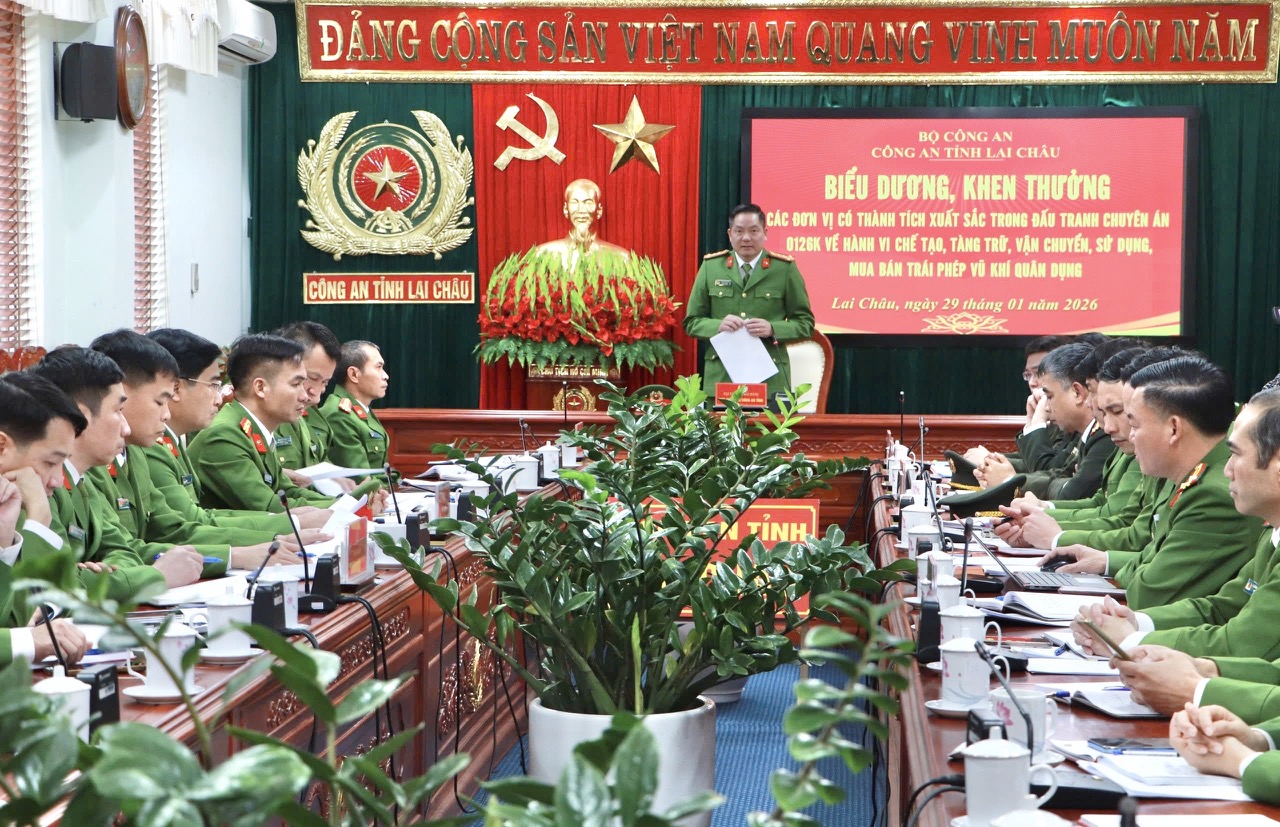 Tại buổi biểu dương, khen thưởng đại diện Phòng Cảnh sát Hình sự - Công an tỉnh đã báo cáo nhanh tình hình đấu tranh Chuyên án 0126K. Theo đó, cuối tháng 12/2025, qua công tác nắm tình hình trên không gian mạng, Phòng Cảnh sát Hình sự - Công an tỉnh Lai Châu phát hiện một đường dây chế tạo, mua bán, vận chuyển, sử dụng trái phép vũ khí quân dụng trên không gian mạng với số lượng lớn, xảy ra trên địa bàn tỉnh Lai Châu và nhiều địa phương trên cả nước.