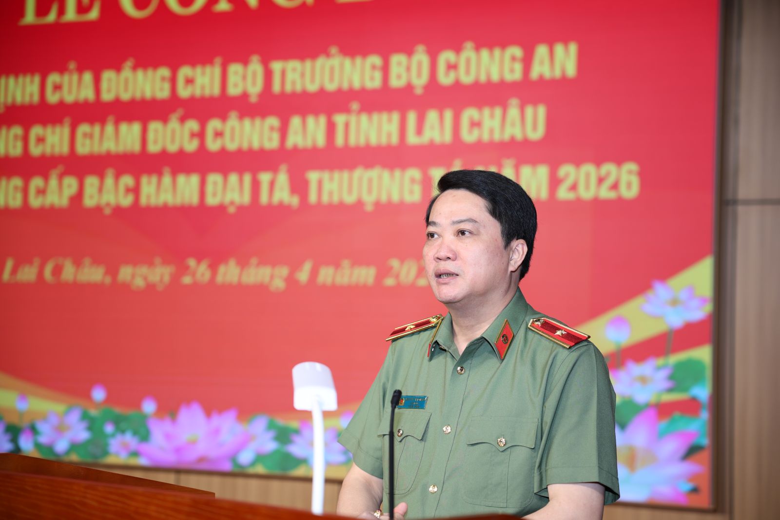 Chiều nay (26/4), Công an tỉnh Lai Châu đã tổ chức Lễ công bố quyết định của đồng chí Bộ trưởng Bộ Công an và đồng chí Giám đốc Công an tỉnh Lai Châu về việc thăng cấp bậc hàm Đại tá, Thượng tá năm 2026. Thiếu tướng Nguyễn Viết Giang - Ủy viên Ban Thường vụ Tỉnh ủy, Giám đốc Công an tỉnh dự và chủ trì buổi Lễ.