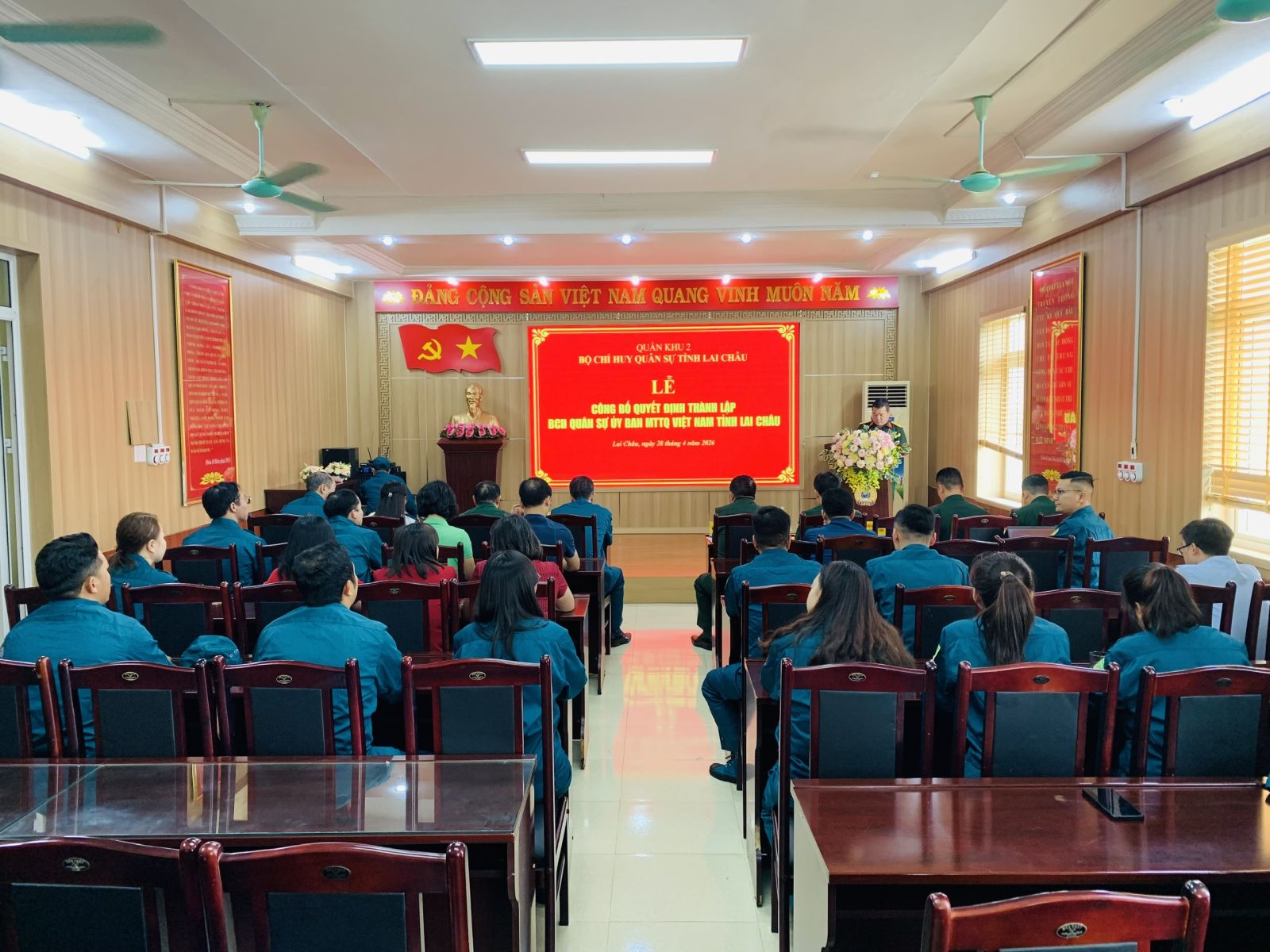 Chiều nay (28/4), Bộ Chỉ huy Quân sự (CHQS) tỉnh Lai Châu đã tổ chức Lễ công bố Quyết định thành lập Ban CHQS tự vệ Ủy ban Mặt trận Tổ quốc (MTTQ) Việt Nam tỉnh Lai Châu. Đại tá Hoàng Thanh Bình - Phó Chỉ huy trưởng Bộ CHQS tỉnh dự phát biểu chỉ đạo tại buổi Lễ.
