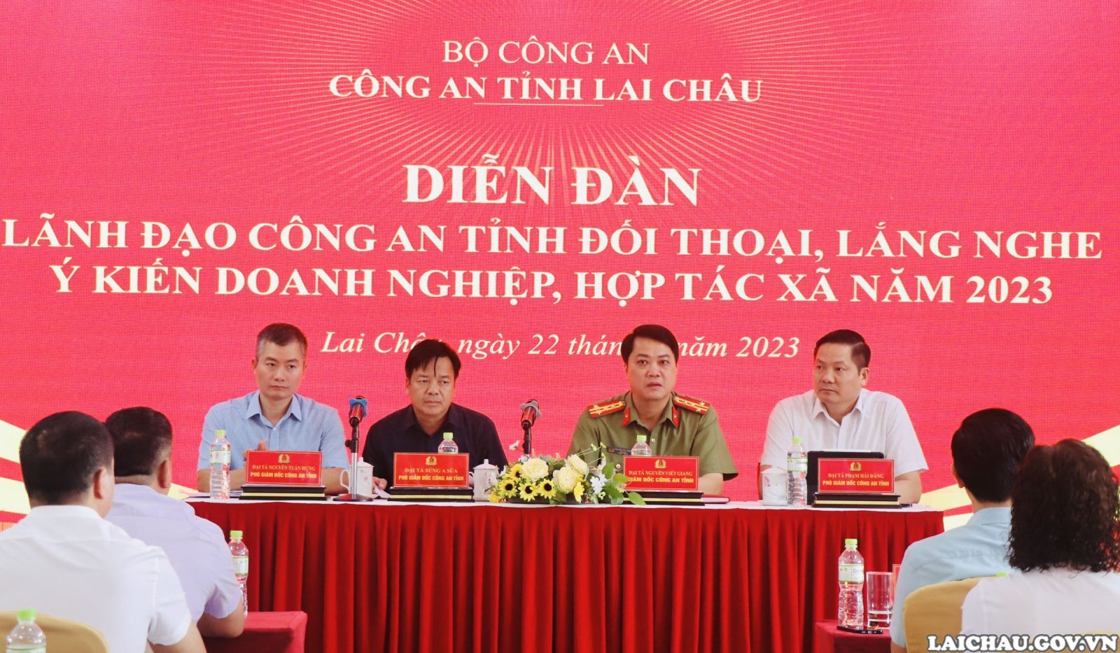 Chiều nay (22/9), Công an tỉnh Lai Châu tổ chức Diễn đàn Lãnh đạo Công an tỉnh đối thoại lắng nghe ý kiến doanh nghiệp, hợp tác xã năm 2023. Các đồng chí Đại tá: Nguyễn Viết Giang - Ủy viên Ban Thường vụ Tỉnh ủy, Giám đốc Công an tỉnh; Sùng A Súa - Phó Giám đốc Công an tỉnh; Phạm Hải Đăng - Phó Giám đốc Công an tỉnh; Nguyễn Tuấn Hưng - Phó Giám đốc Công an tỉnh đồng chủ trì Diễn đàn.