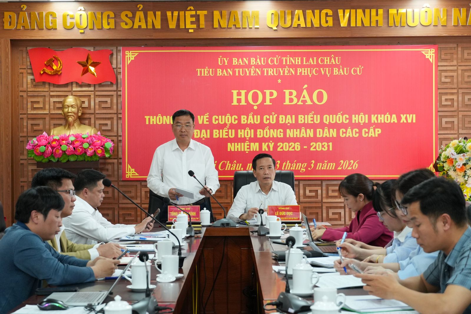Chiều nay (3/3), Tiểu ban Tuyên truyền phục vụ bầu cử tỉnh Lai Châu tổ chức Họp báo thông tin về công tác chuẩn bị bầu cử đại biểu Quốc hội khóa XVI và đại biểu HĐND các cấp nhiệm kỳ 2026 - 2031. Các đồng chí: Tống Thanh Bình - Ủy viên Ban Thường vụ Tỉnh ủy, Phó Chủ tịch Thường trực Ủy ban MTTQ Việt Nam tỉnh, Phó Chủ tịch Ủy ban bầu cử tỉnh; Lê Đức Dục - Ủy viên Ban Thường vụ Tỉnh ủy, Trưởng Ban Tuyên giáo và Dân vận Tỉnh ủy, Trưởng Tiểu ban Tuyên truyền phục vụ bầu cử tỉnh chủ trì Họp báo.