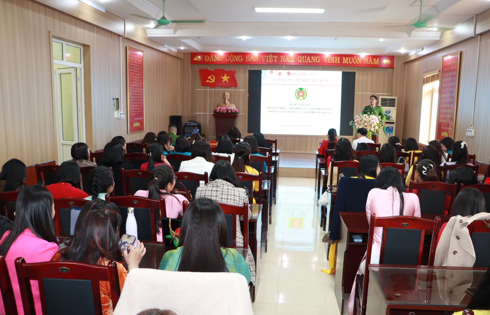 Với mong muốn mỗi cán bộ, công chức, viên chức, người lao động là một “lá chắn số” vững vàng - thông minh, tỉnh táo và chủ động bảo vệ mình trong thời đại công nghệ, Trung tá Nguyễn Ngọc Phương - Phó Đội trưởng Đội Tệ nạn Xã hội, Phòng Cảnh sát hình sự, Công an tỉnh đã thông tin khái quát về tình hình tội phạm lừa đảo trực tuyến trên phạm vi cả nước cũng như tại địa phương. Đồng thời phân tích xu hướng gia tăng của loại tội phạm này với phương thức, thủ đoạn ngày càng tinh vi, chuyên nghiệp; chỉ ra những tác động tiêu cực của lừa đảo trên không gian mạng đối với cá nhân, gia đình và xã hội; nguy cơ ảnh hưởng trực tiếp đến nữ cán bộ, công chức, viên chức, người lao động trong bối cảnh chuyển đổi số cũng như cách nhận diện các phương thức, thủ đoạn lừa đảo phổ biến; kỹ năng phòng ngừa và tự bảo vệ trong môi trường số…