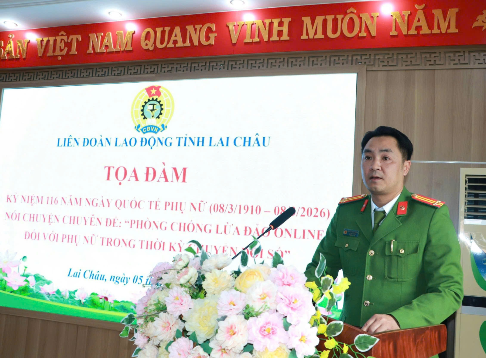 Nhân dịp kỷ niệm 116 năm ngày Quốc Tế phụ nữ và 1986 năm khởi nghĩa Hai Bà Trưng, chiều nay (5/3), Liên đoàn Lao động tỉnh tổ chức Tọa đàm kỷ niệm 116 năm ngày Quốc Tế phụ nữ (08/3/1910 - 08/3/2026) nói chuyện chuyên đề “Phòng chống lừa đảo online đối với phụ nữ trong thời kỳ chuyển đổi số”.