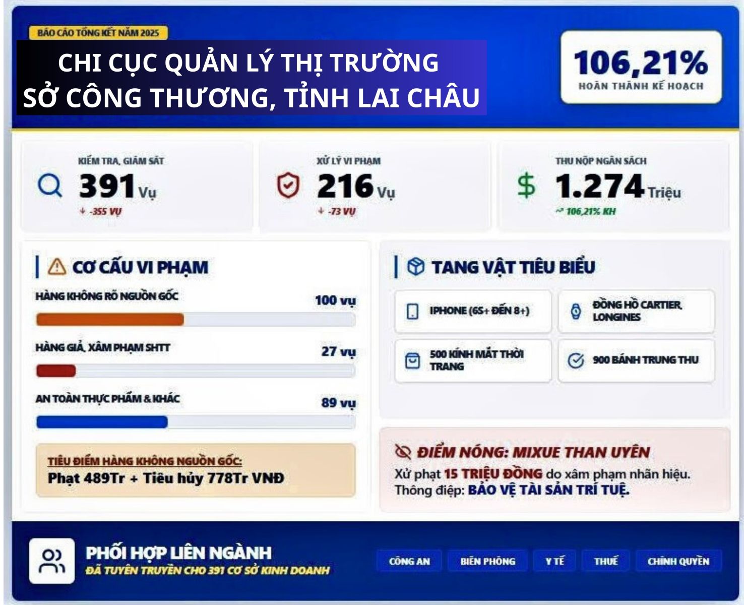 Năm 2025, lực lượng QLTT tỉnh Lai Châu đã kiểm tra, giám sát 391vụ, xử lý 216 vụ vi phạm với 237 hành vi vi phạm. So với năm 2024, số vụ kiểm tra và xử lý giảm mạnh (số vụ kiểm tra, giám sát giảm 355 vụ và số vụ xử lý giảm 73 vụ vi phạm), phản ánh sự chuyển hướng từ “đánh rộng” sang “đánh trúng”, tập trung vào các hành vi vi phạm trọng yếu, tác động trực tiếp đến thị trường và người tiêu dùng. Tổng số tiền thu nộp ngân sách Nhà nước đạt 1.274,622 triệu đồng, hoàn thành 106,21% kế hoạch định hướng của Cục Quản lý và Phát triển thị trường trong nước giao.