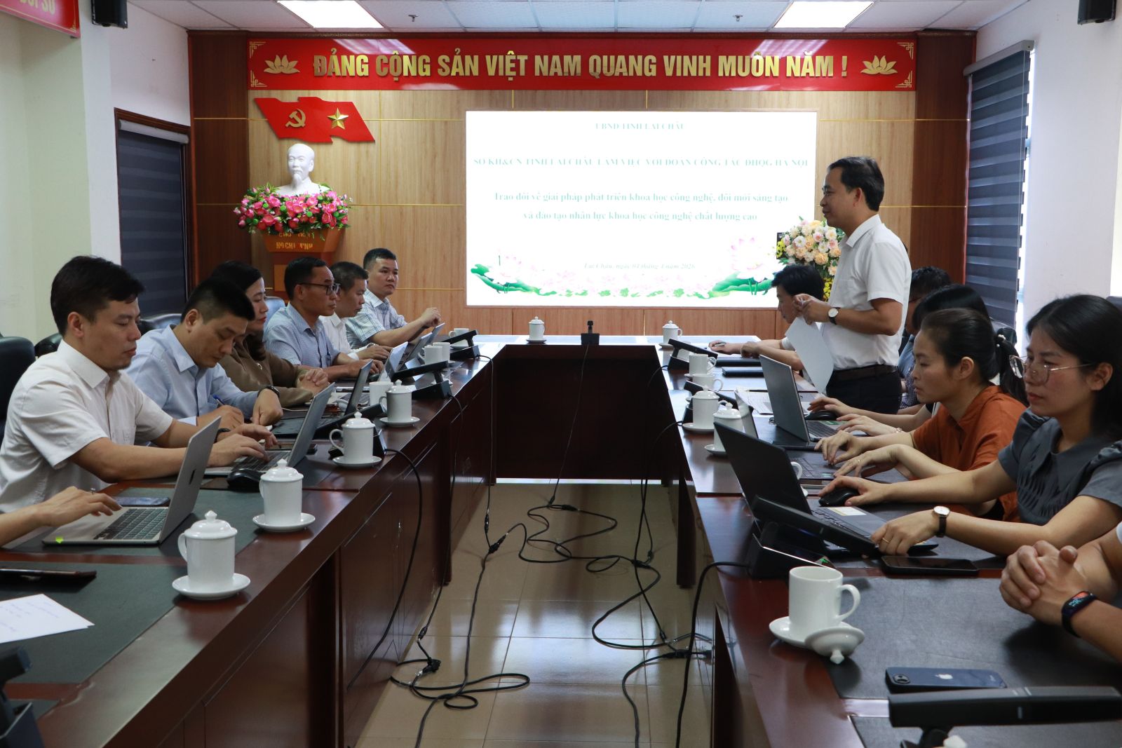 Phát biểu tại buổi làm việc, đồng chí Phạm Quang Cường - Phó Giám đốc Sở Khoa học và Công nghệ tỉnh Lai Châu nhấn mạnh, tỉnh Lai Châu luôn xác định khoa học, công nghệ và đổi mới sáng tạo là động lực quan trọng thúc đẩy tăng trưởng, nâng cao năng suất, chất lượng và góp phần thúc đẩy tăng trưởng kinh tế - xã hội của tỉnh sức cạnh tranh của nền kinh tế. Hiện tỉnh đang ưu tiên một số nhóm nhiệm vụ khoa học công nghệ và đổi mới sáng tạo như: Nghiên cứu, ứng dụng khoa học và công nghệ phát triển sản phẩm Sâm Lai Châu và dược liệu trên địa bàn tỉnh Lai Châu giai đoạn 2026 - 2030; nghiên cứu, ứng dụng công nghệ (chế biến, AI, IoT) trong hoạt động quản lý tài nguyên thiên nhiên và phòng chống thiên tai; nghiên cứu, ứng dụng công nghệ số, công nghệ AI, IoT trong bảo tồn, phổ biến văn hóa các dân tộc tại tỉnh Lai Châu gắn với phát triển du lịch…
