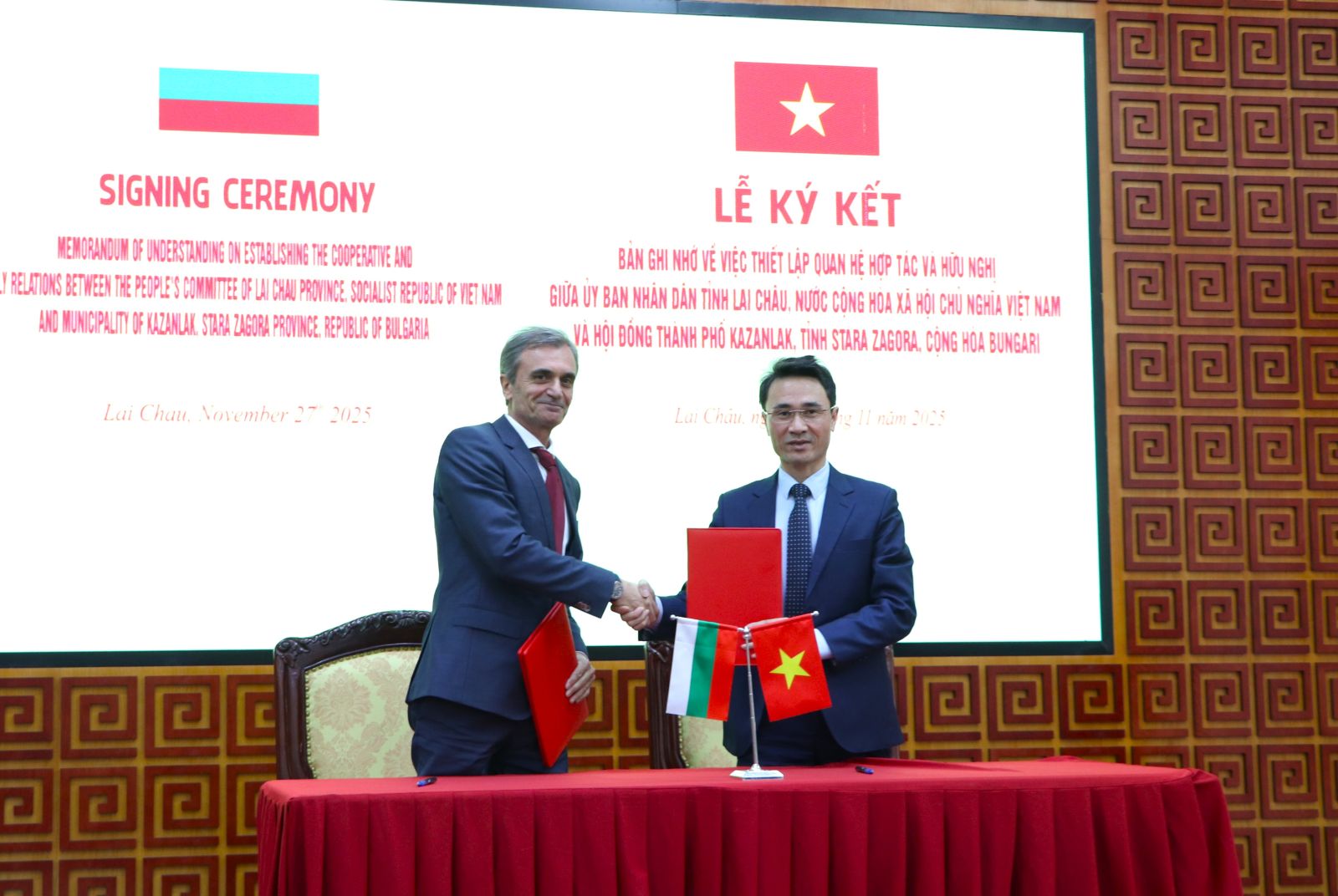 Ngày 27/11/2025, tại tỉnh Lai Châu (Việt Nam), UBND tỉnh Lai Châu đã ký kết Biên bản ghi nhớ về việc thiết lập quan hệ hợp tác và hữu nghị với Hội đồng thành phố Kazanlak, tỉnh Stara Zagora, Cộng hòa Bungari. Cổng Thông tin điện tử tỉnh Lai Châu đăng toàn văn nội dung Biên bản.